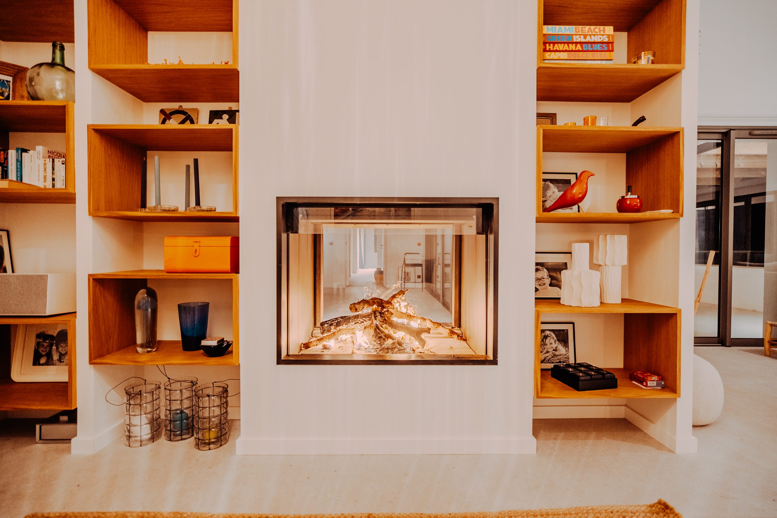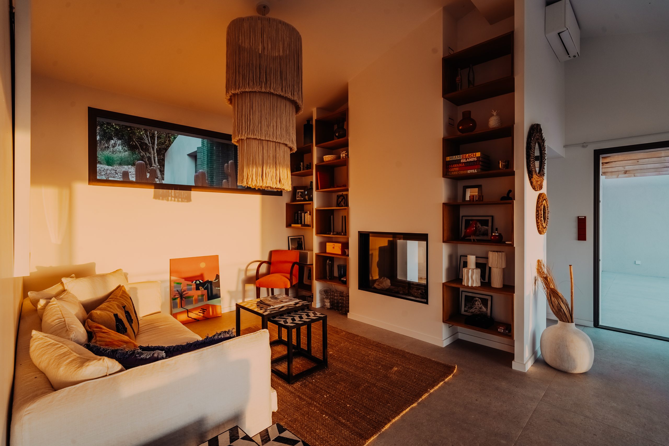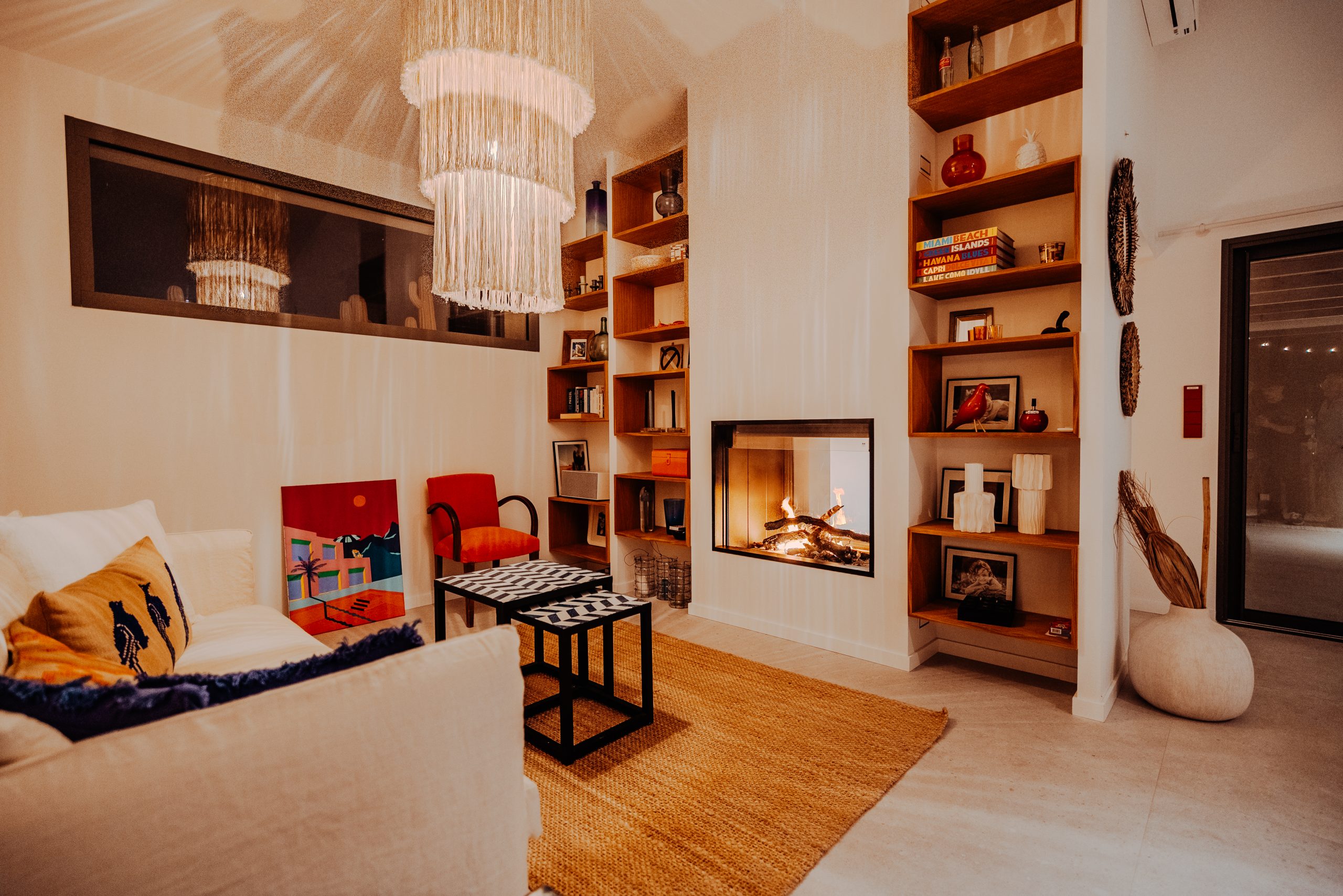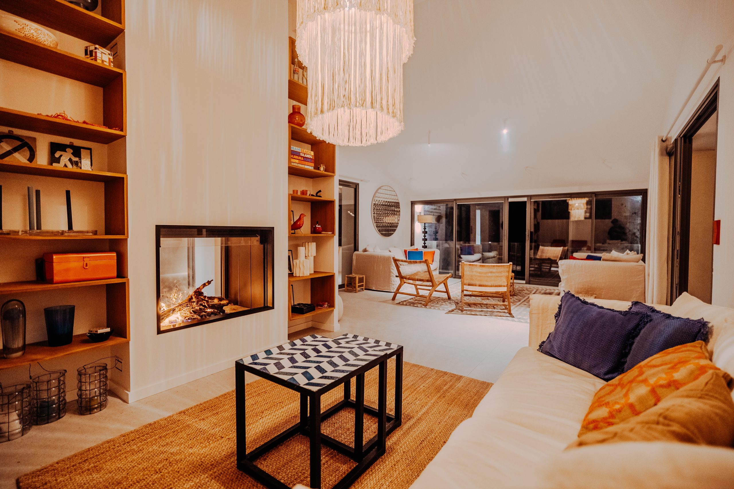 Le salon se distingue par ses volumes généreux et son atmosphère chaleureuse. Il est équipé d’une cheminée double face, créant une ambiance élégante et conviviale en toute saison. Un système sonore de qualité accompagne les moments de détente, tandis qu’une bibliothèque décorée vient souligner le caractère raffiné et authentique du lieu.
