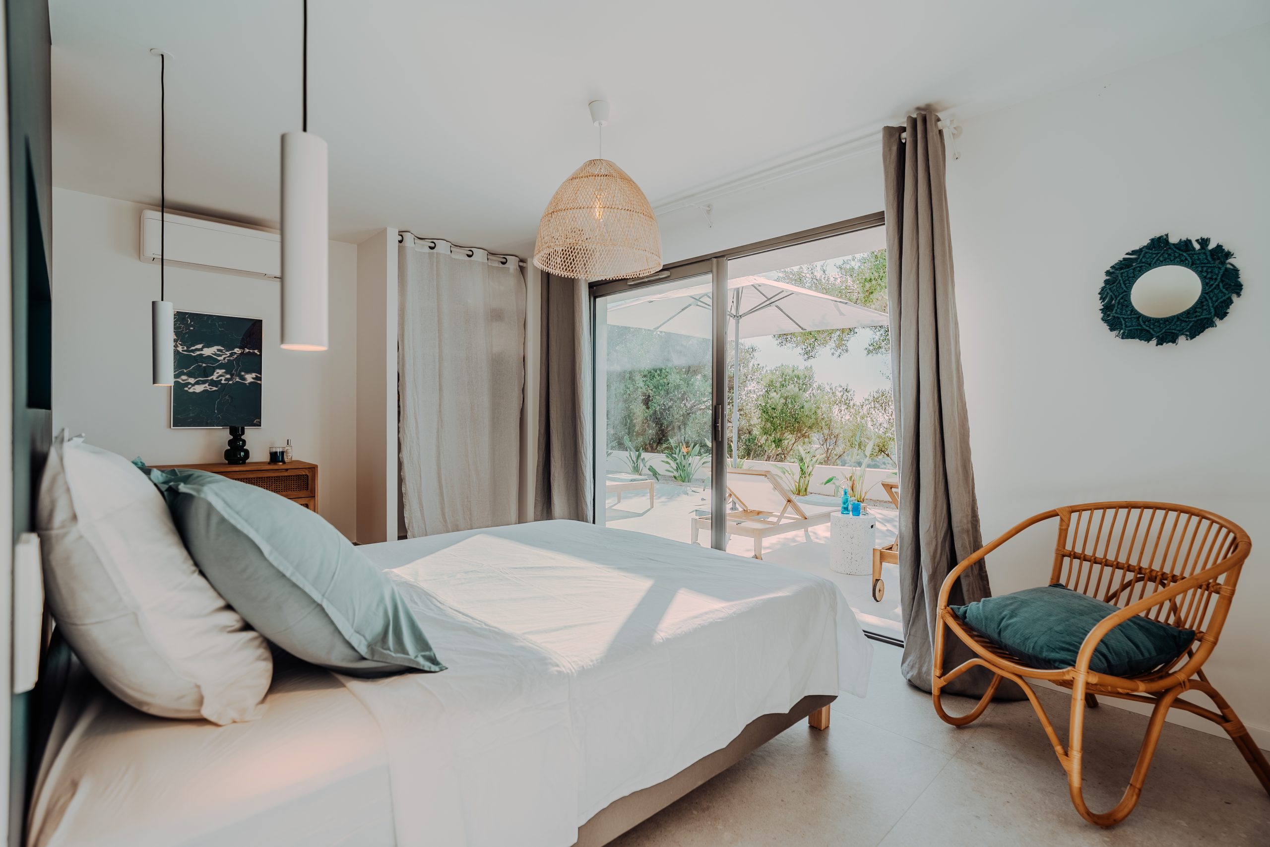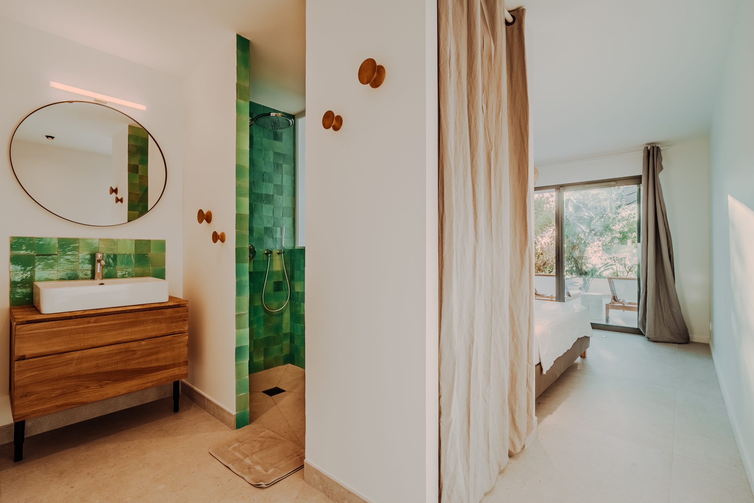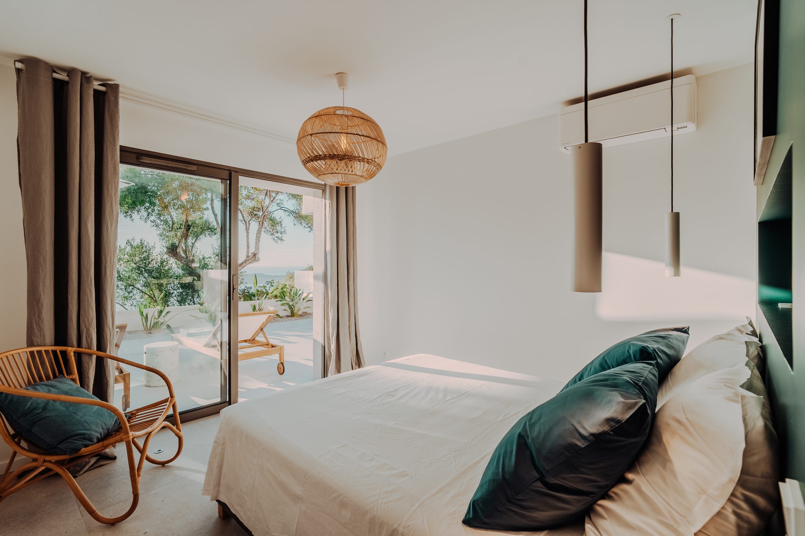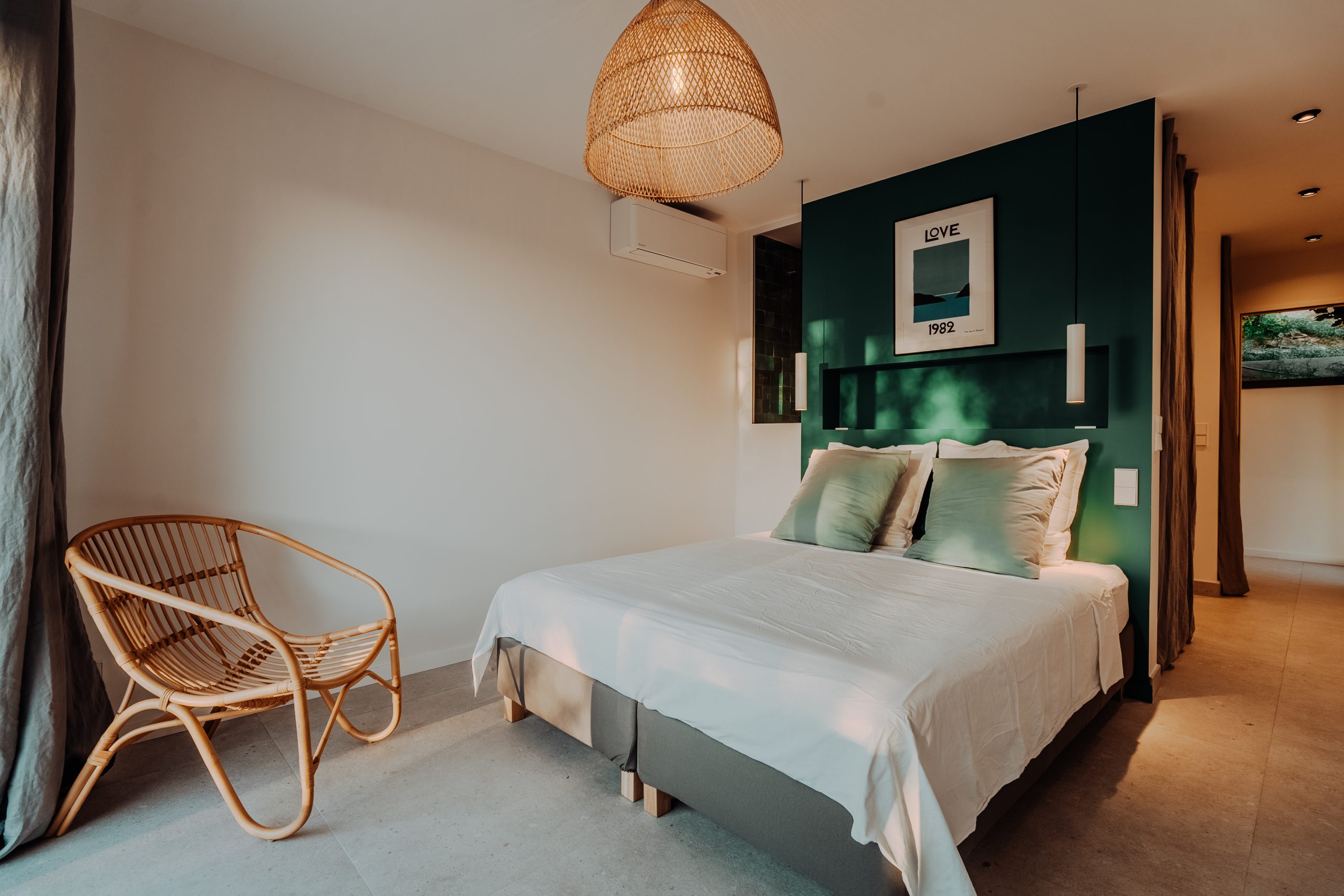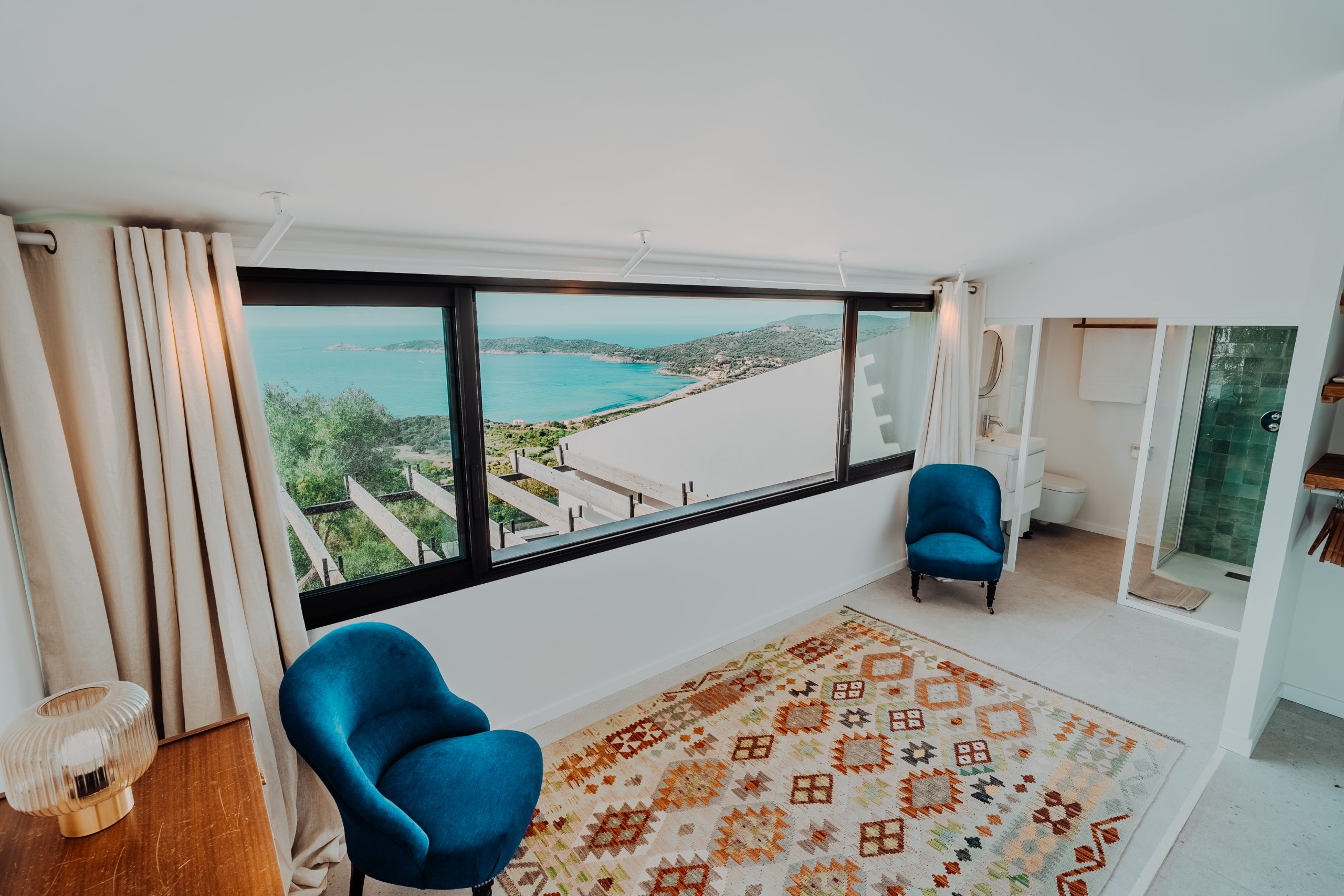 À l’étage inférieur, cette chambre avec lit double, climatisée et offrant une vue mer, est conçue pour le calme et la détente. Elle comprend une salle de bain privative avec douche à l’italienne en zellige marocain et WC séparés, ainsi qu’un accès direct à la terrasse de la piscine, pour profiter pleinement du cadre naturel.