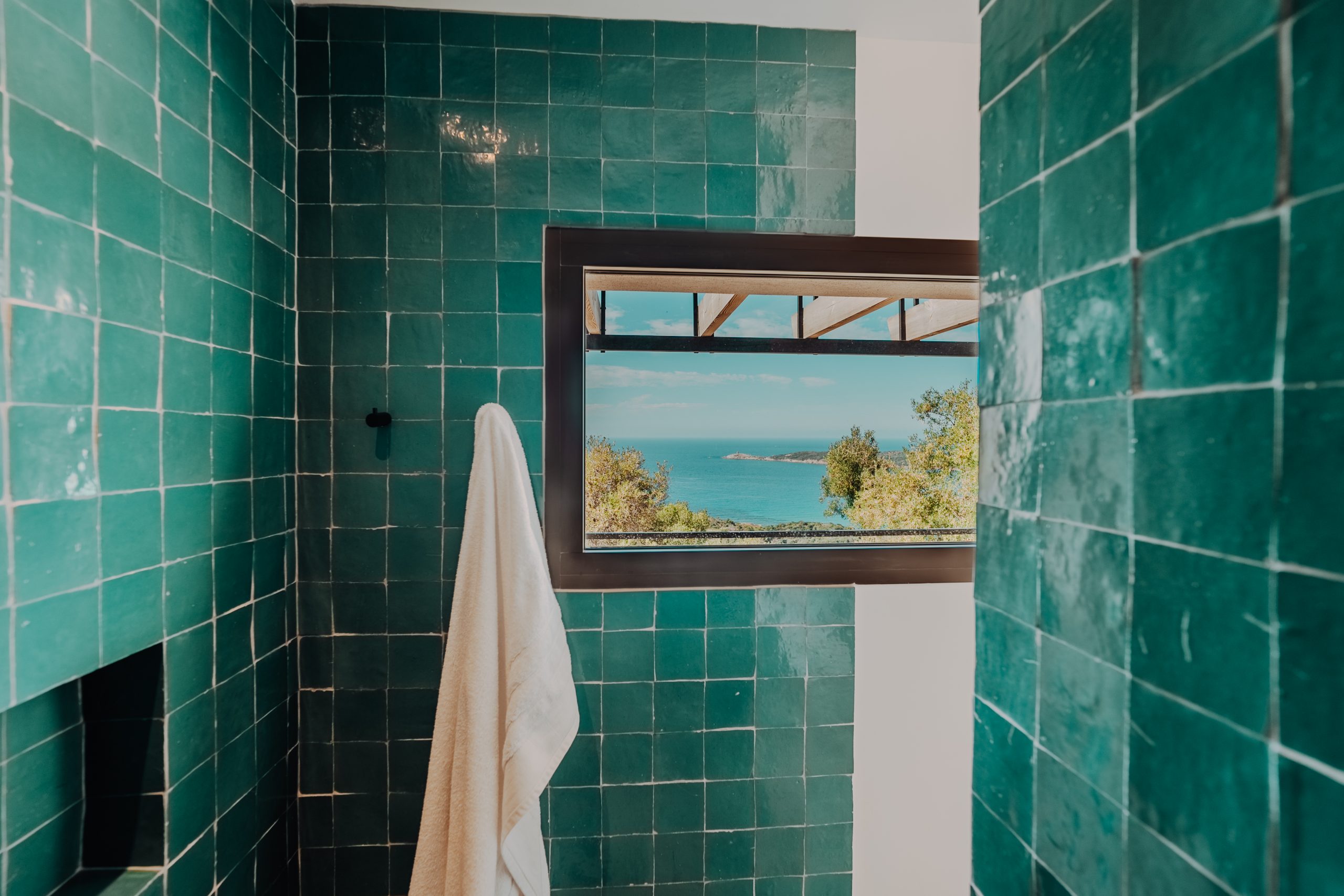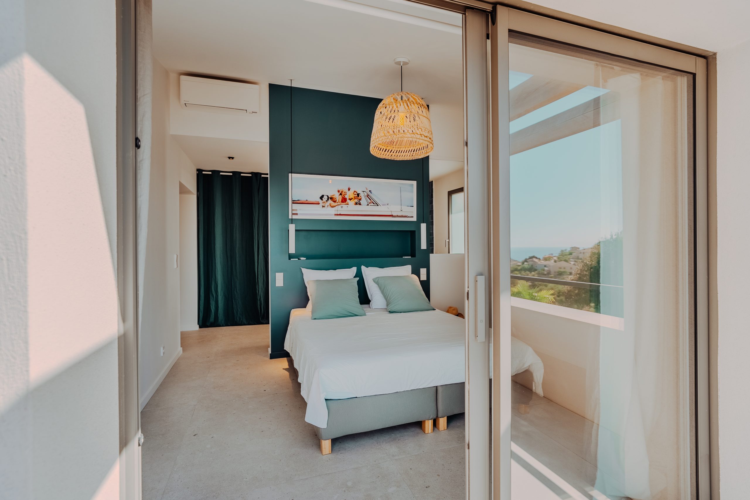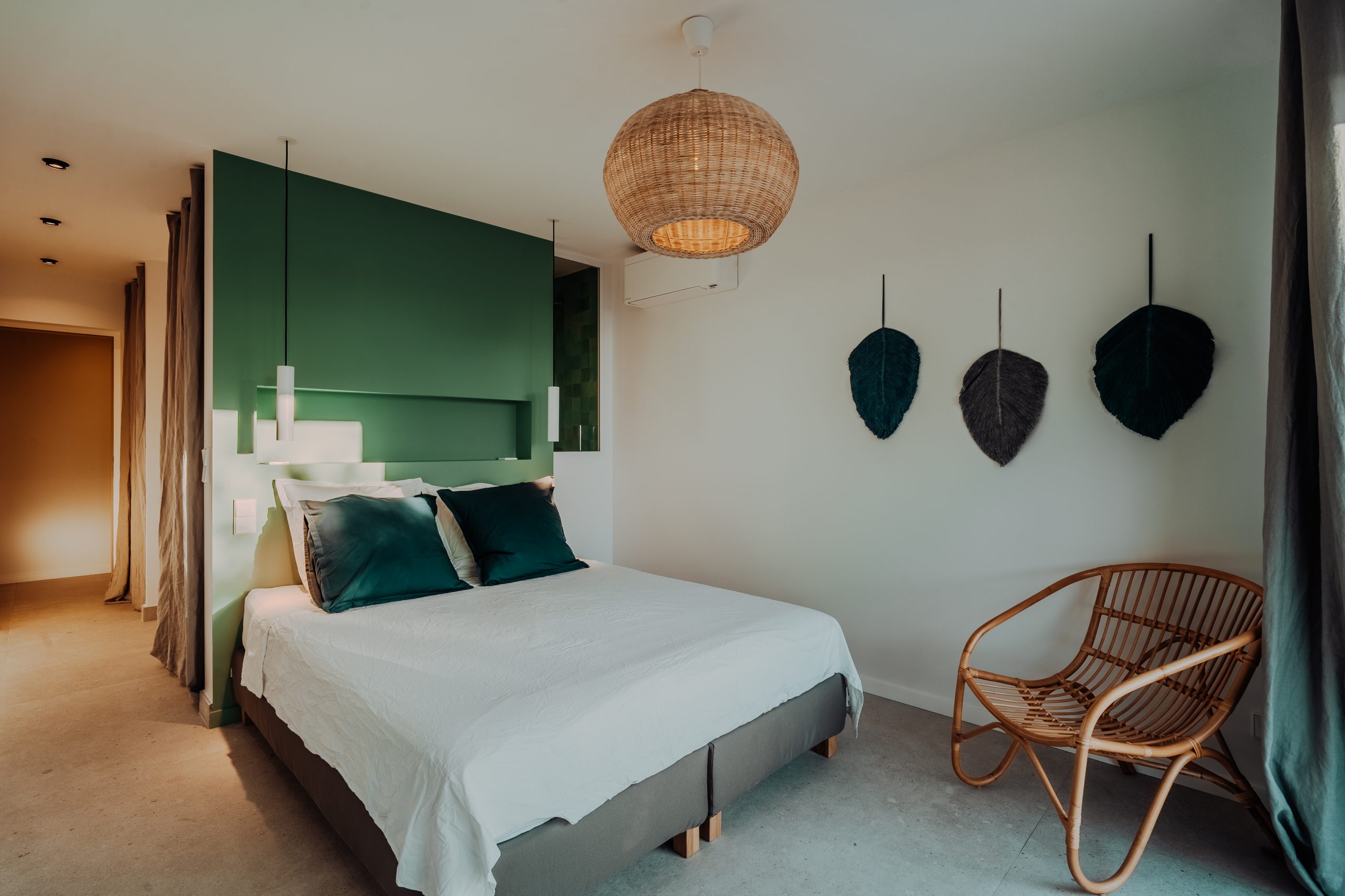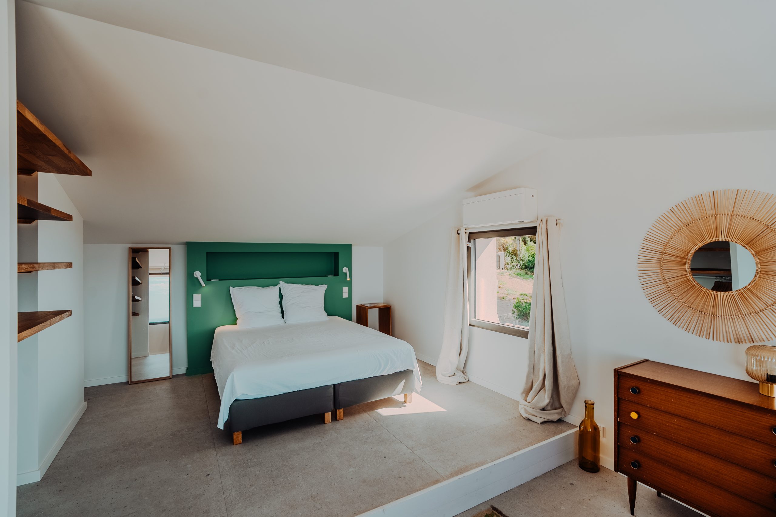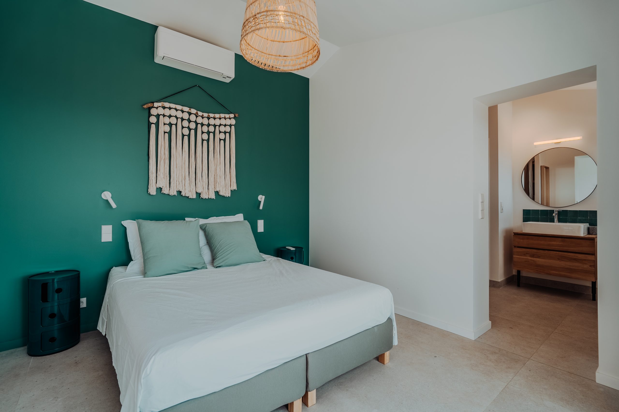 À l’étage inférieur, cette chambre avec lit double, climatisée et offrant une vue mer, est conçue pour le calme et la détente. Elle comprend une salle de bain privative avec douche à l’italienne en zellige marocain et WC séparés, ainsi qu’un accès direct à la terrasse de la piscine, pour profiter pleinement du cadre naturel.