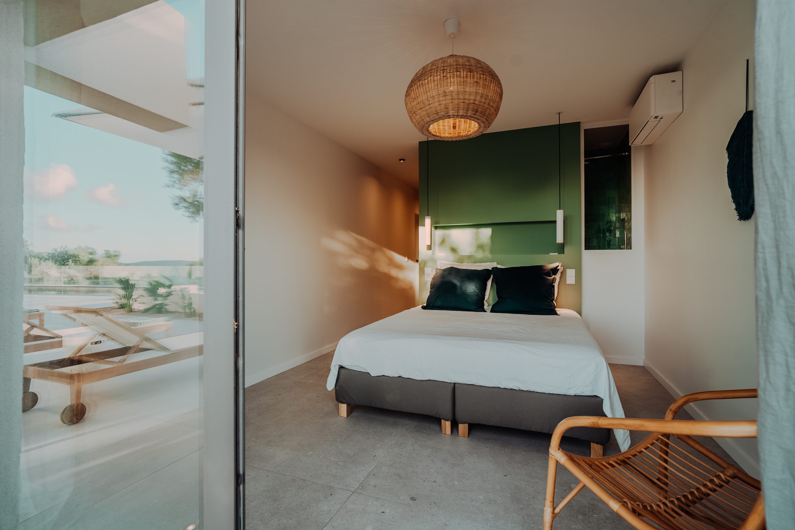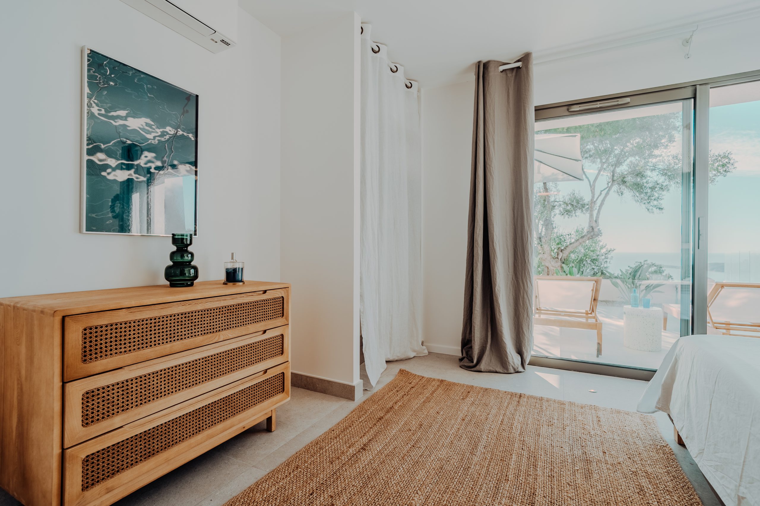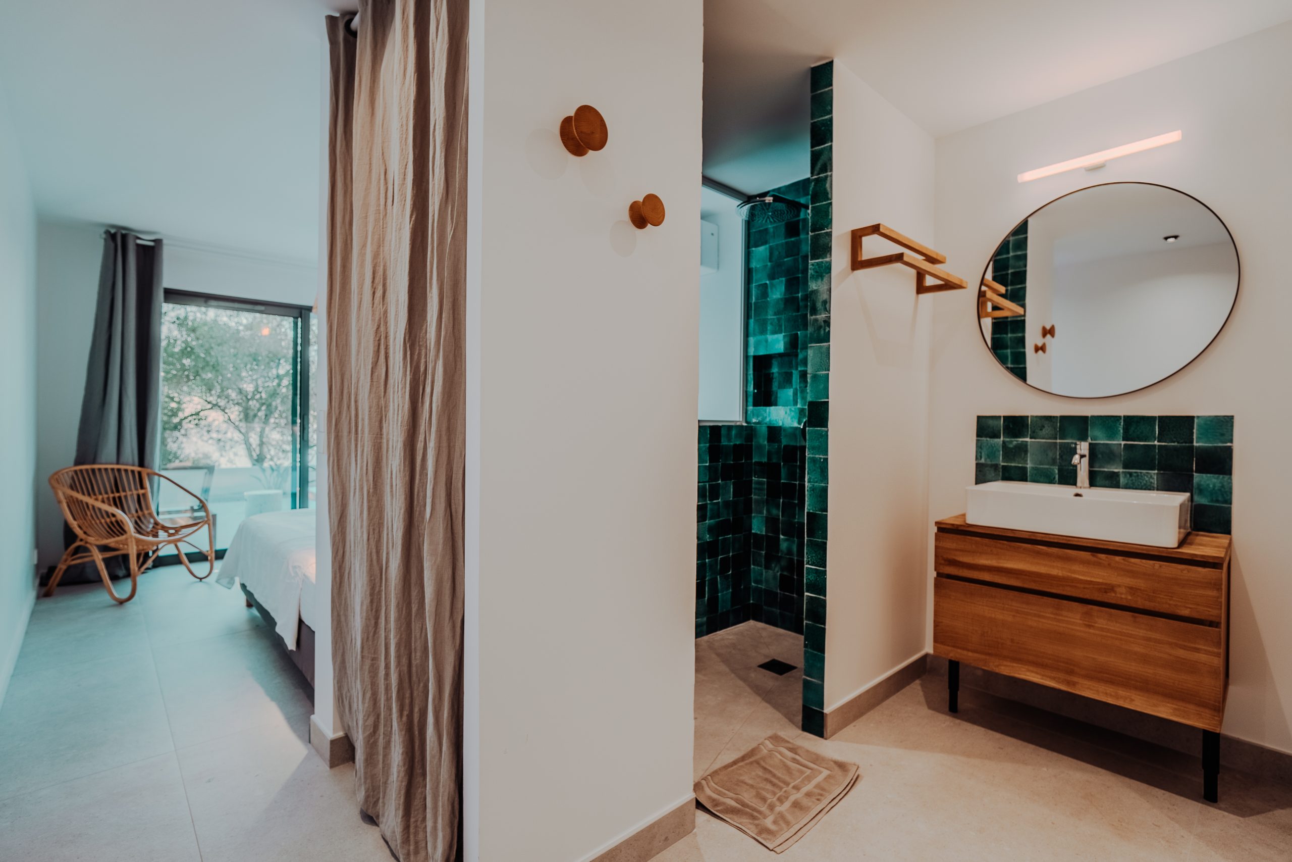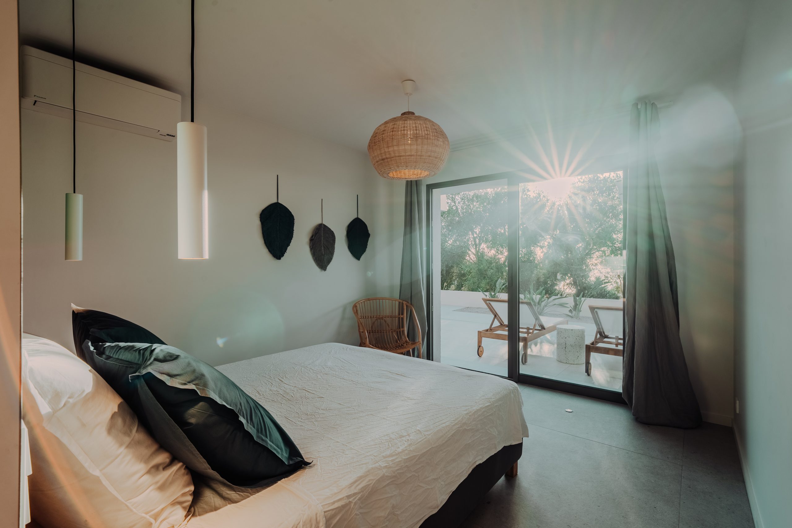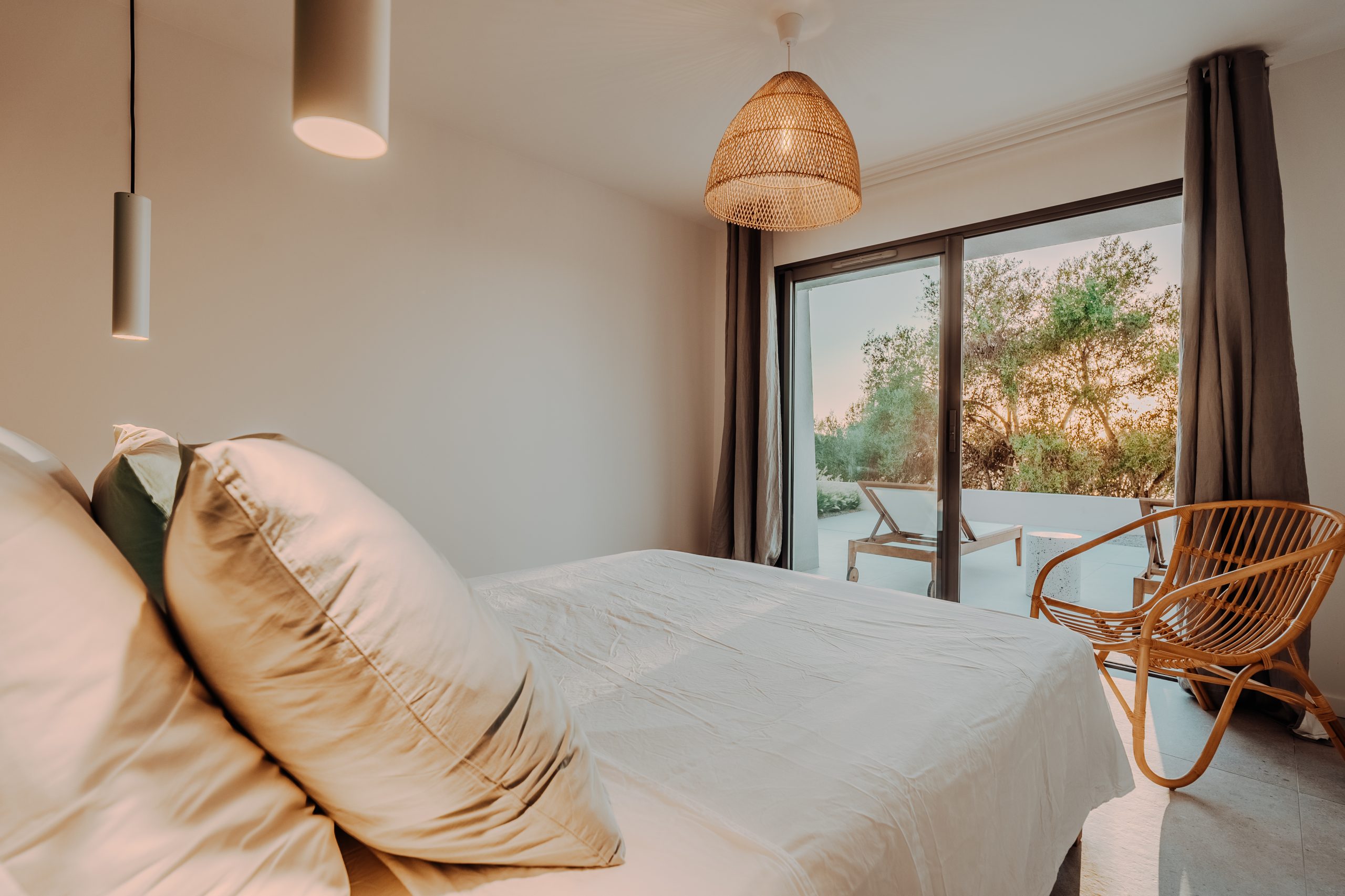 À l’étage inférieur, cette chambre avec lit double, climatisée et offrant une vue mer, est conçue pour le calme et la détente. Elle comprend une salle de bain privative avec douche à l’italienne en zellige marocain et WC séparés, ainsi qu’un accès direct à la terrasse de la piscine, pour profiter pleinement du cadre naturel.