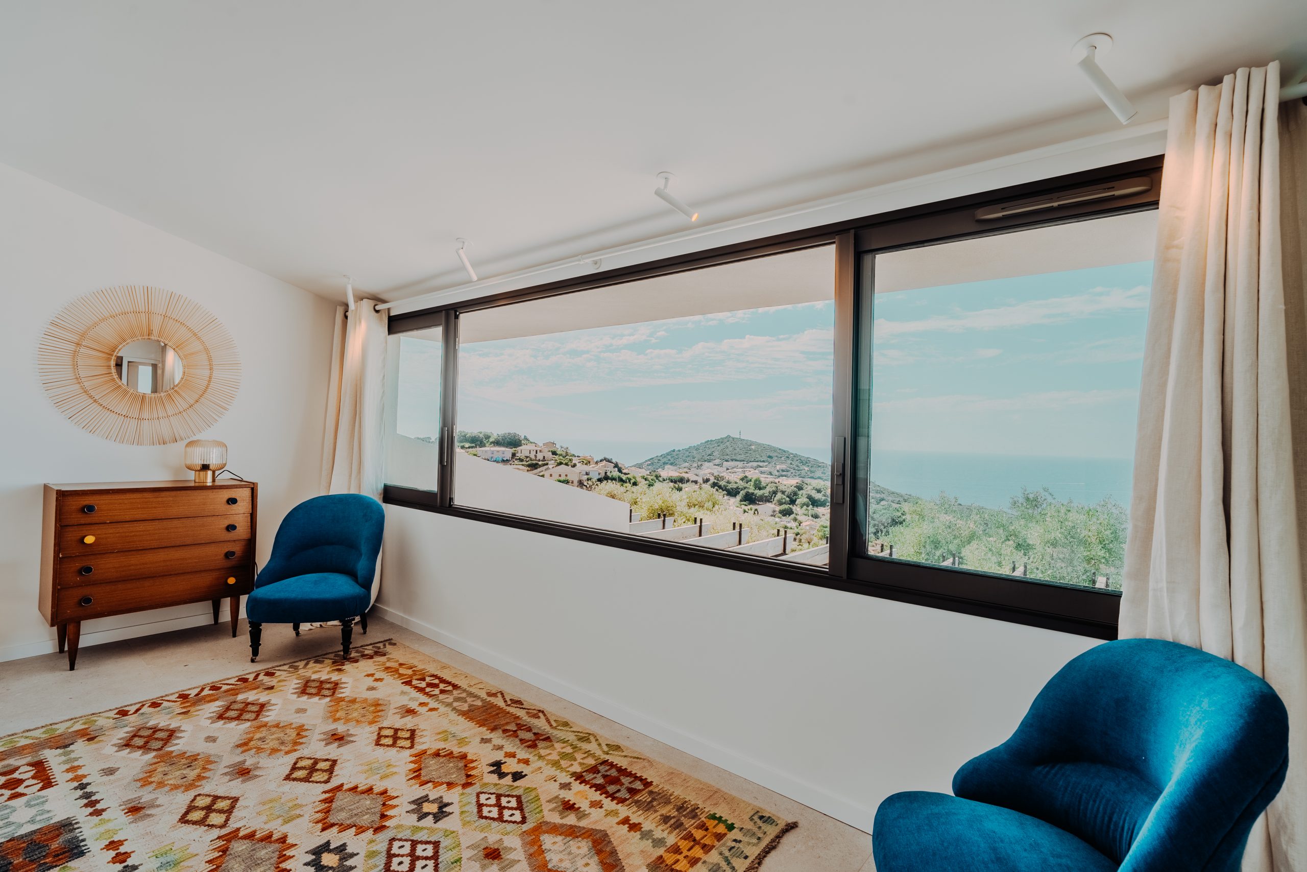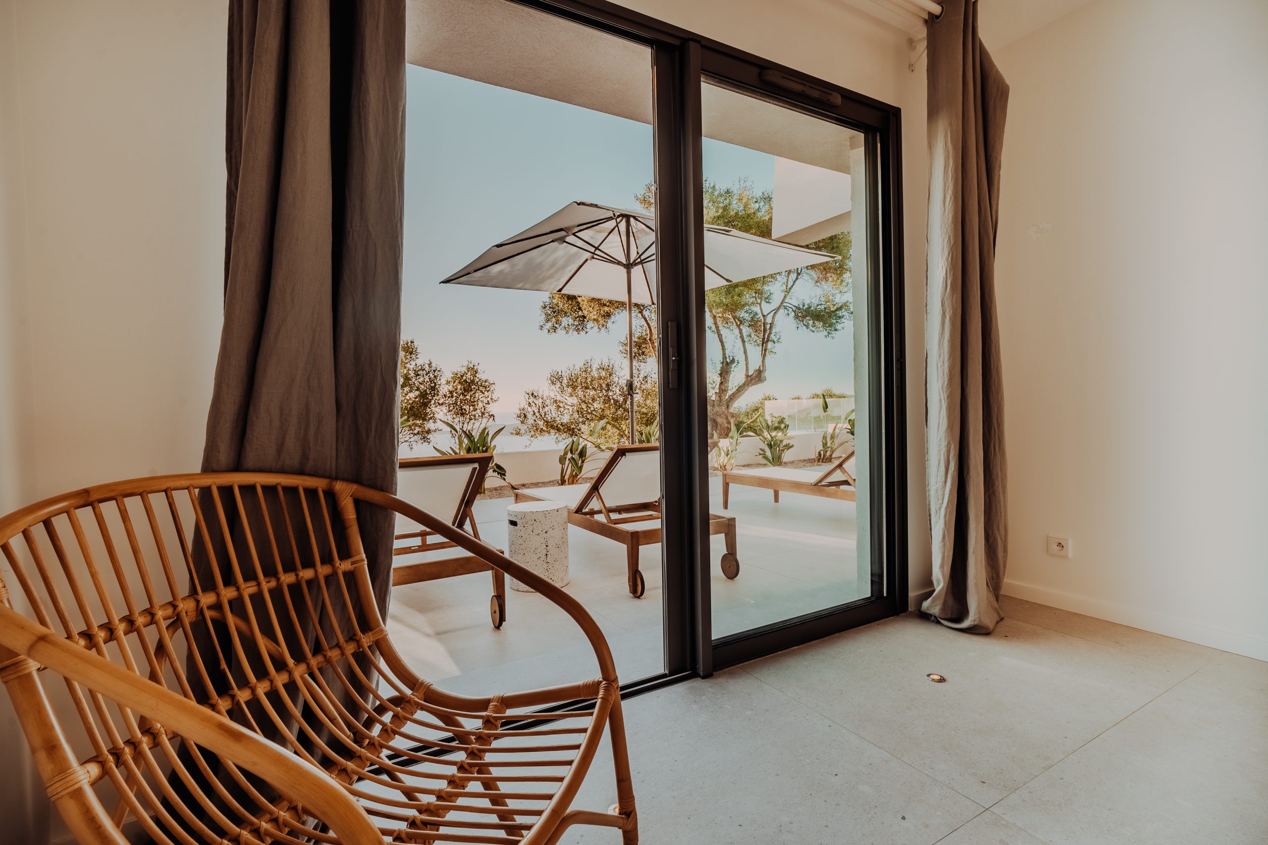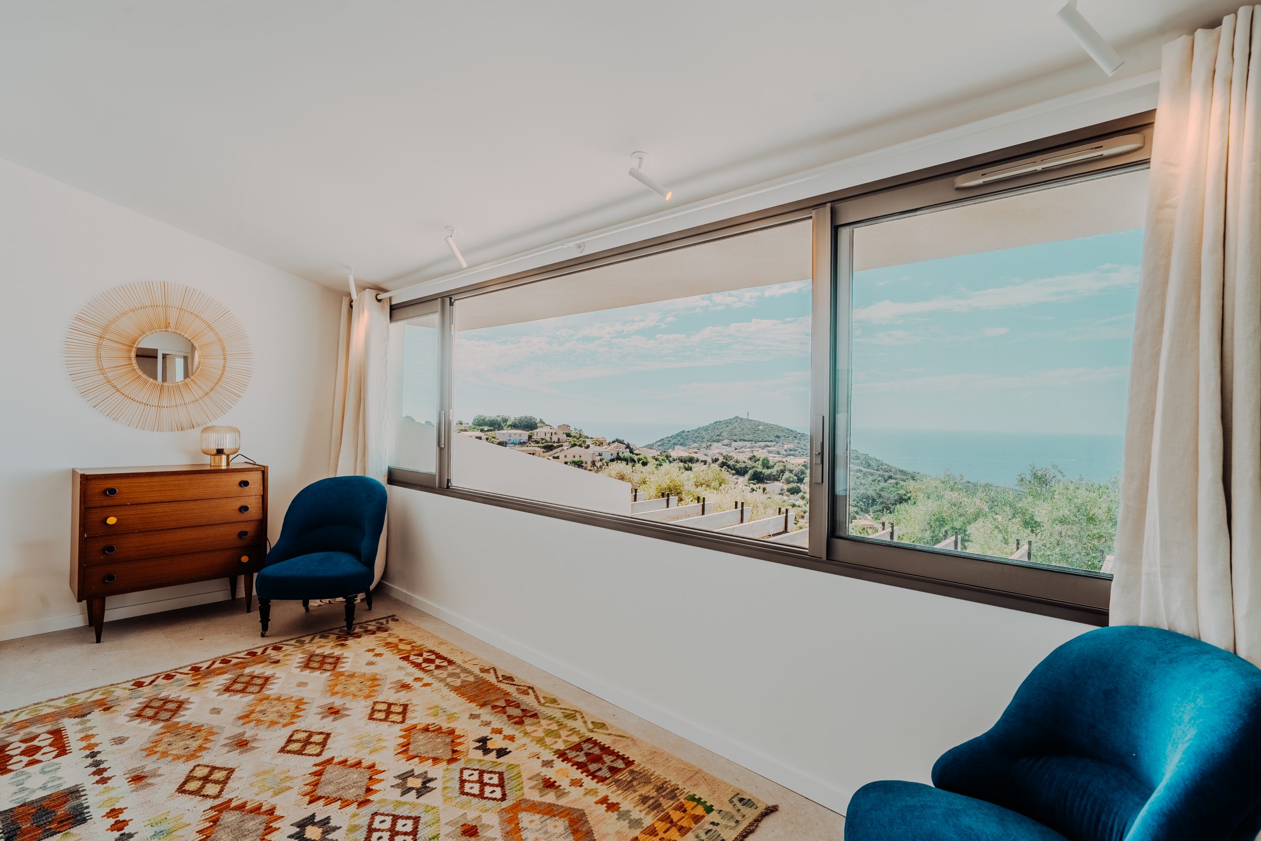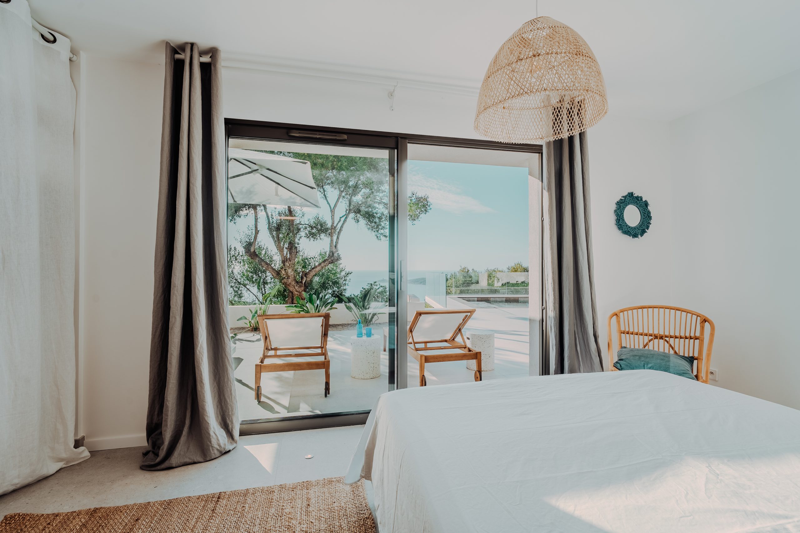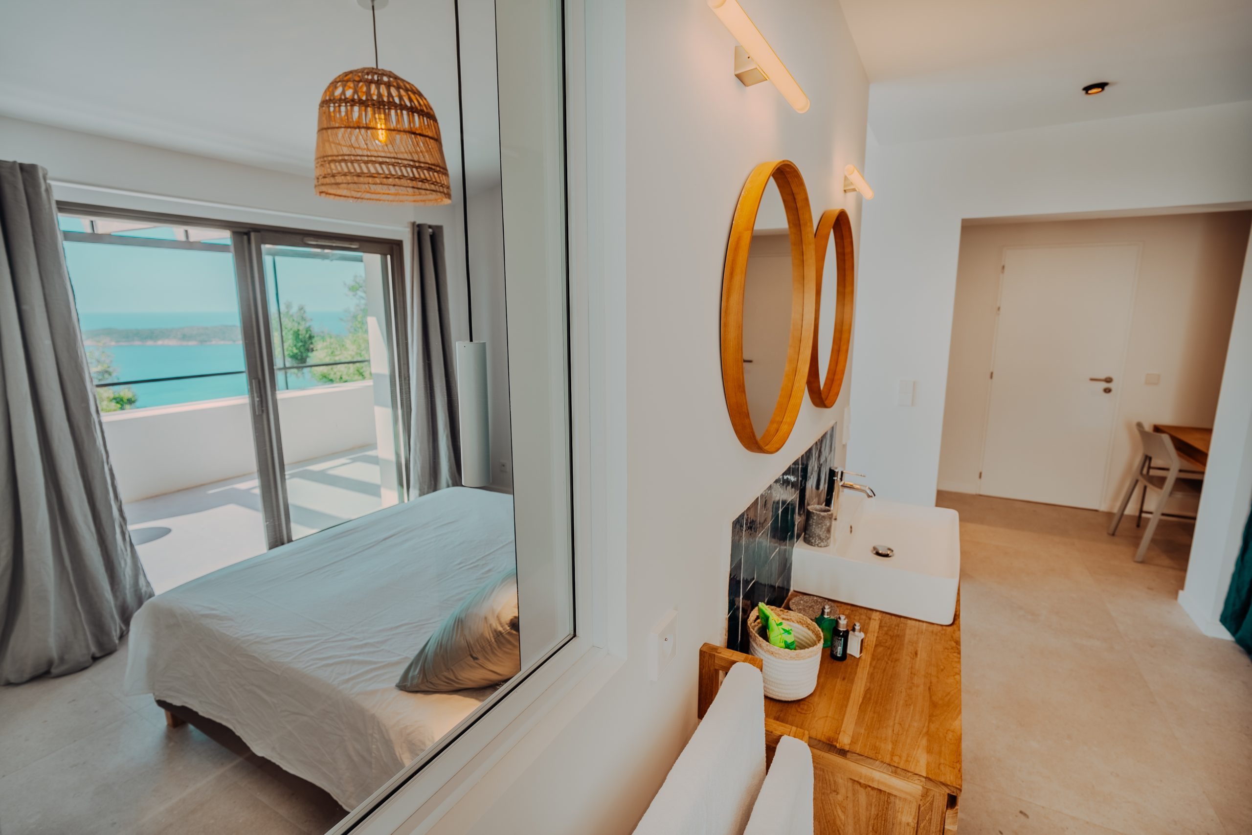À l’étage inférieur, cette chambre avec lit double, climatisée et offrant une vue mer, est conçue pour le calme et la détente. Elle comprend une salle de bain privative avec douche à l’italienne en zellige marocain et WC séparés, ainsi qu’un accès direct à la terrasse de la piscine, pour profiter pleinement du cadre naturel.