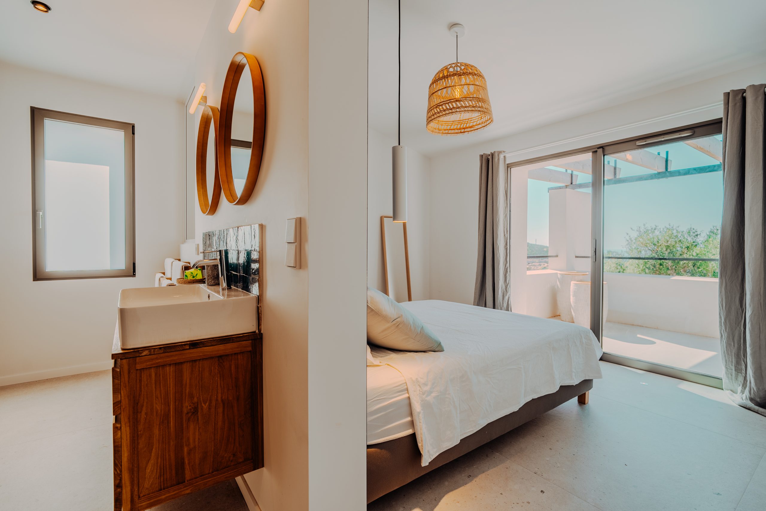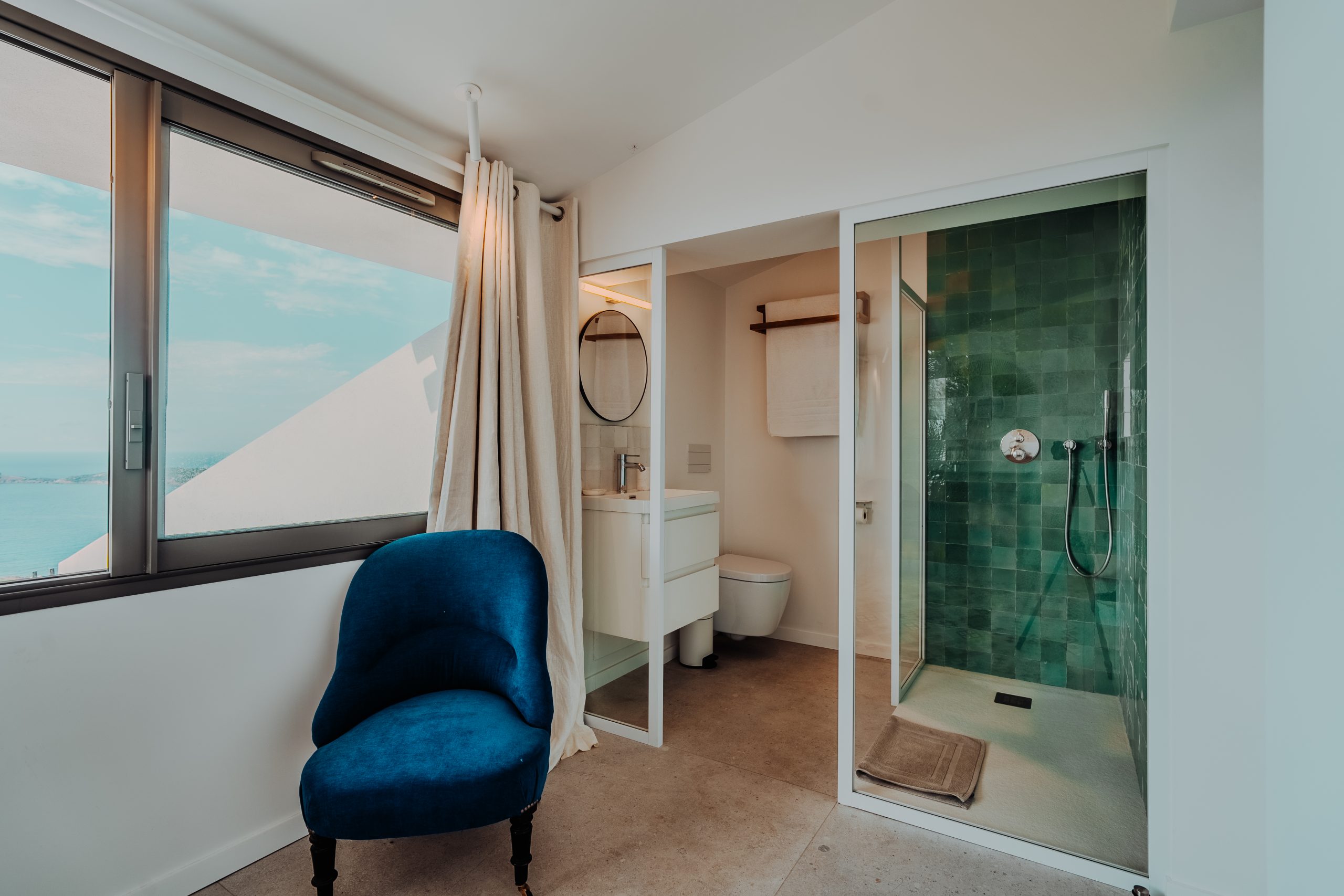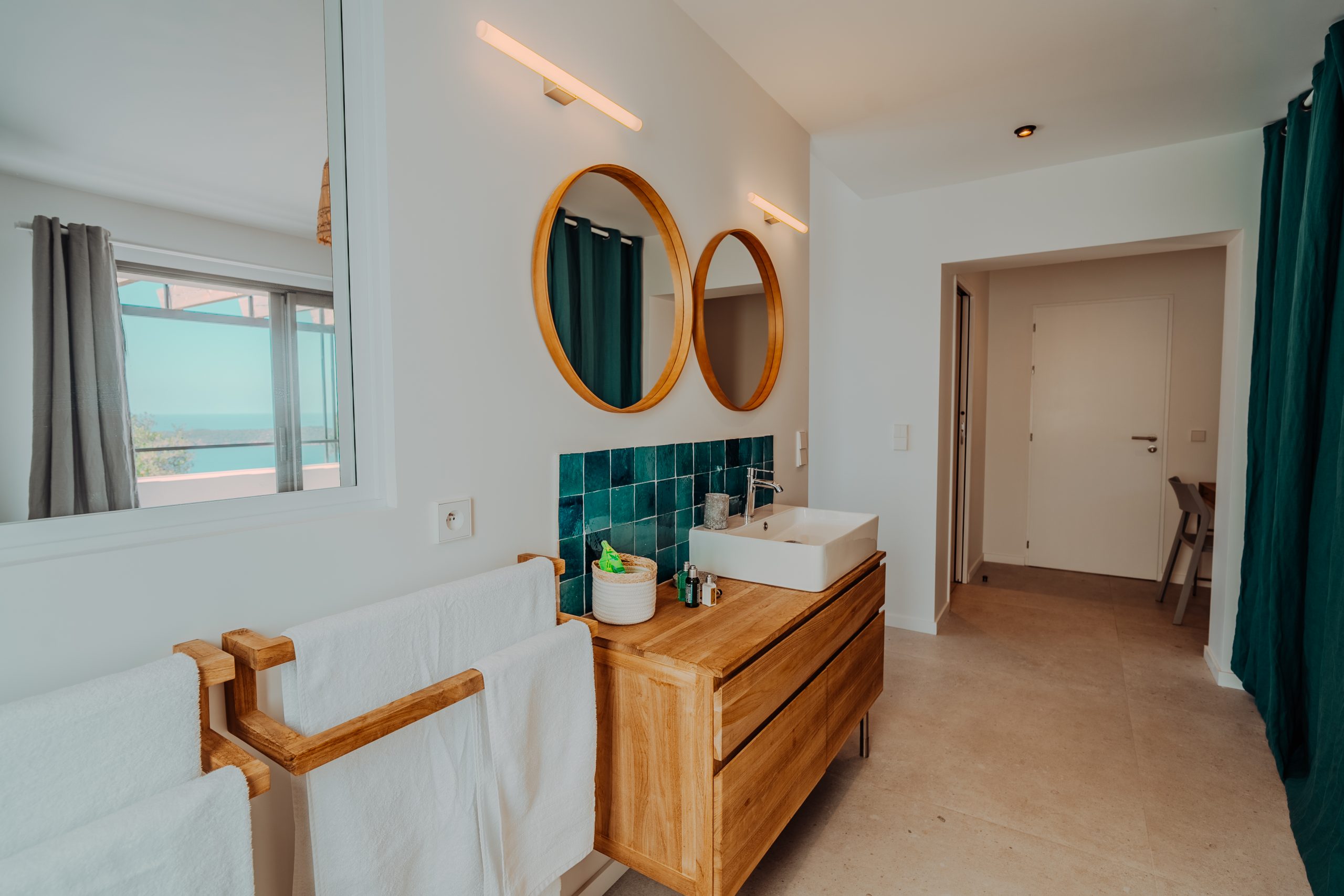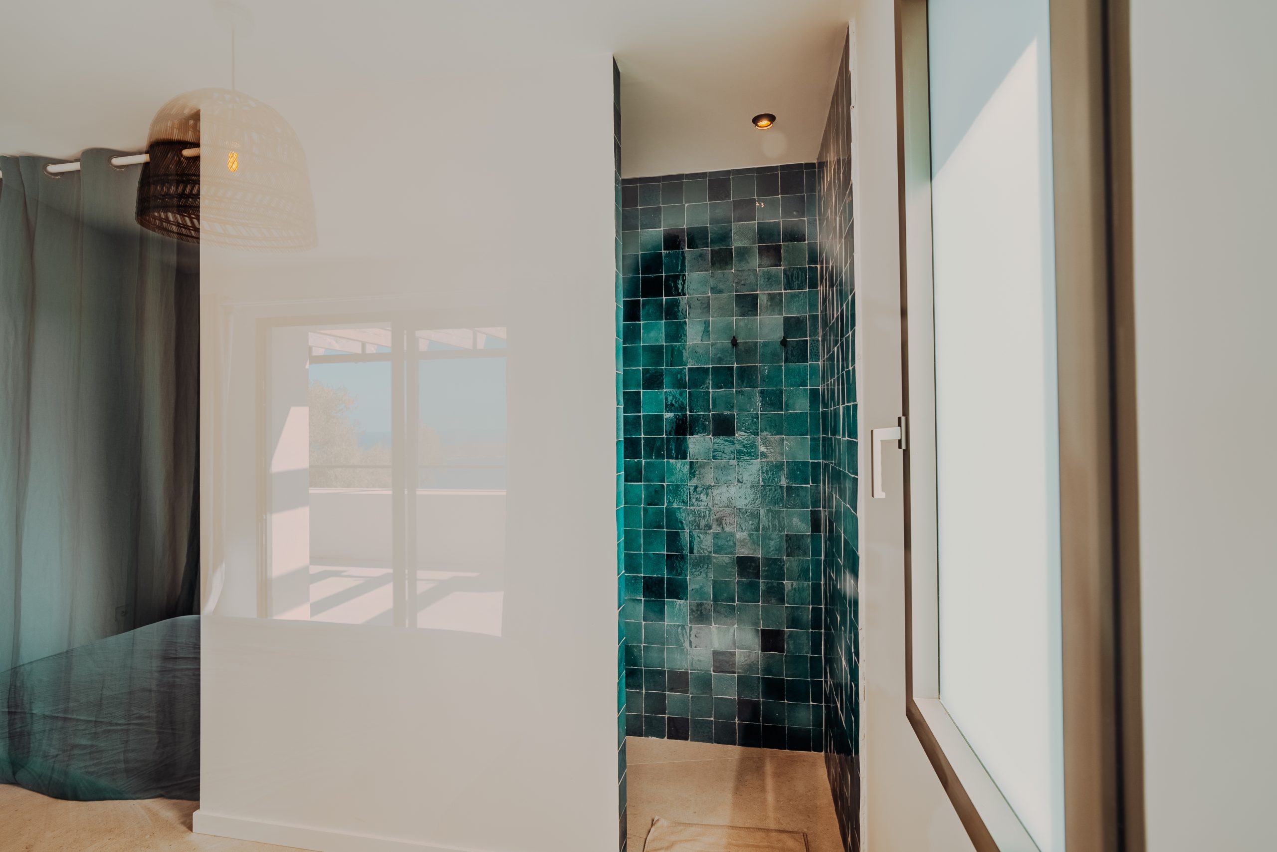 À l’étage intermédiaire, cette chambre avec lit double, climatisée et offrant une vue mer, séduit par son élégance et sa sérénité. Elle comprend une salle de bain privative avec douche à l’italienne en zellige marocain et WC séparés. Un accès direct à la terrasse côté cuisine permet de profiter pleinement de l’extérieur et du panorama.