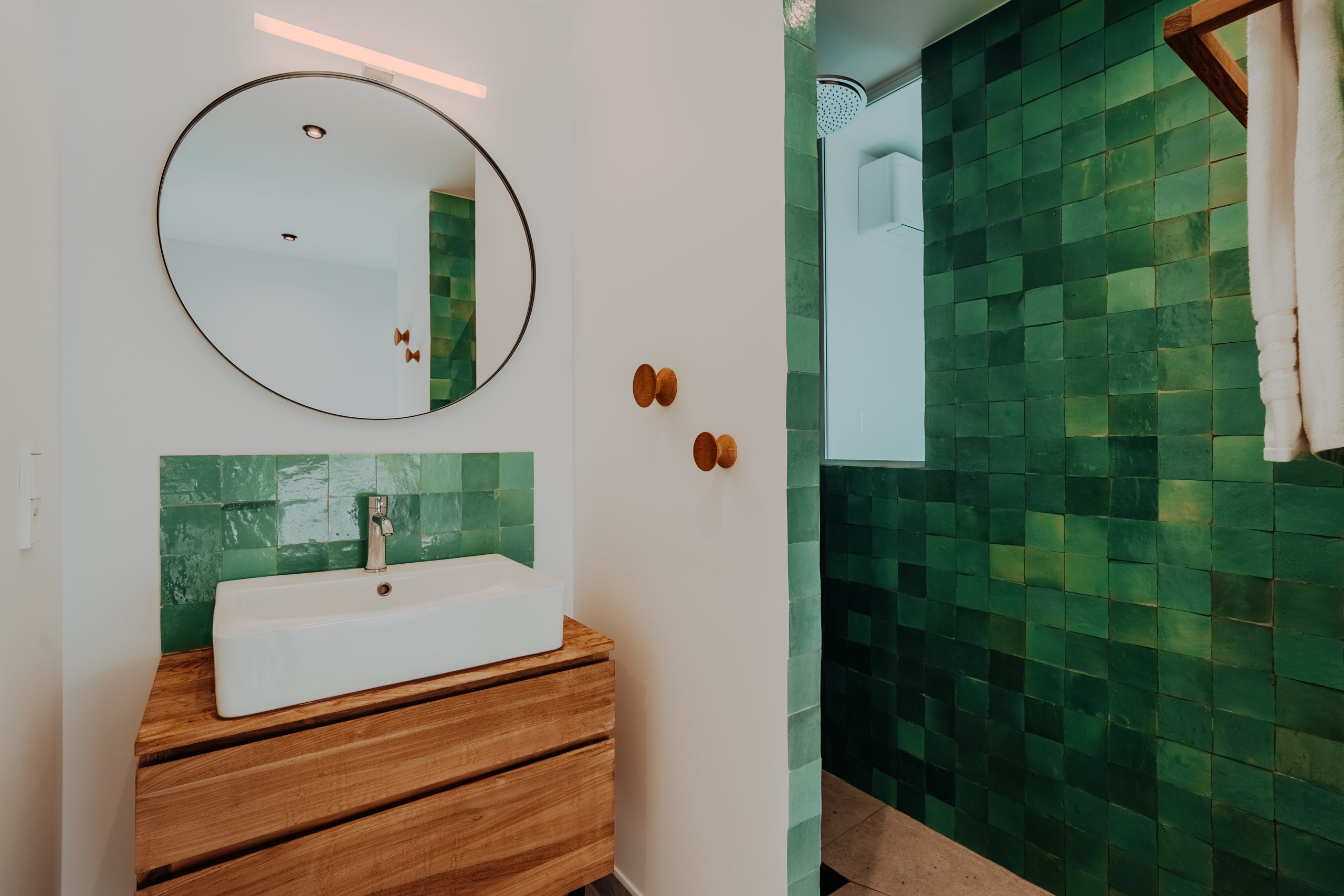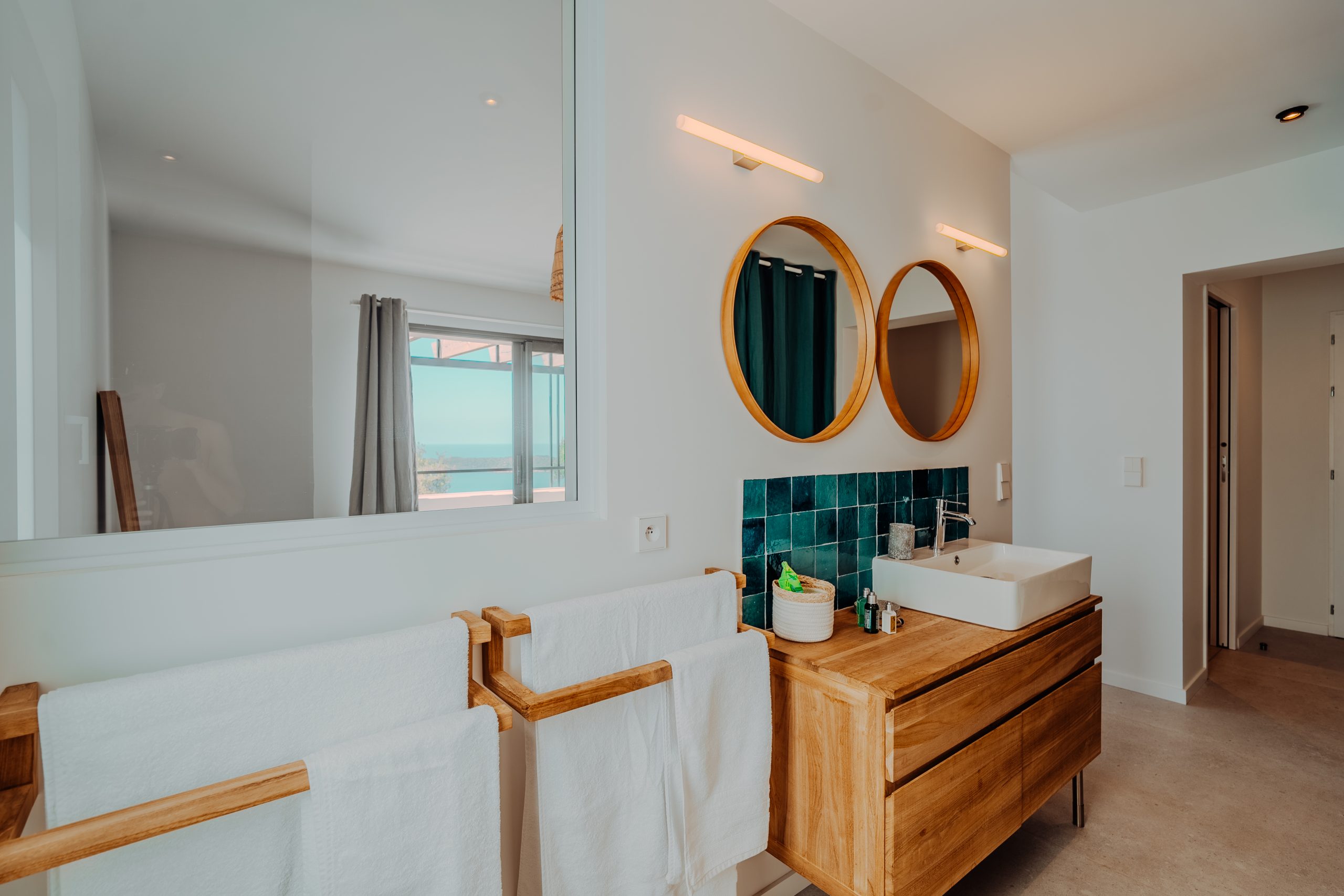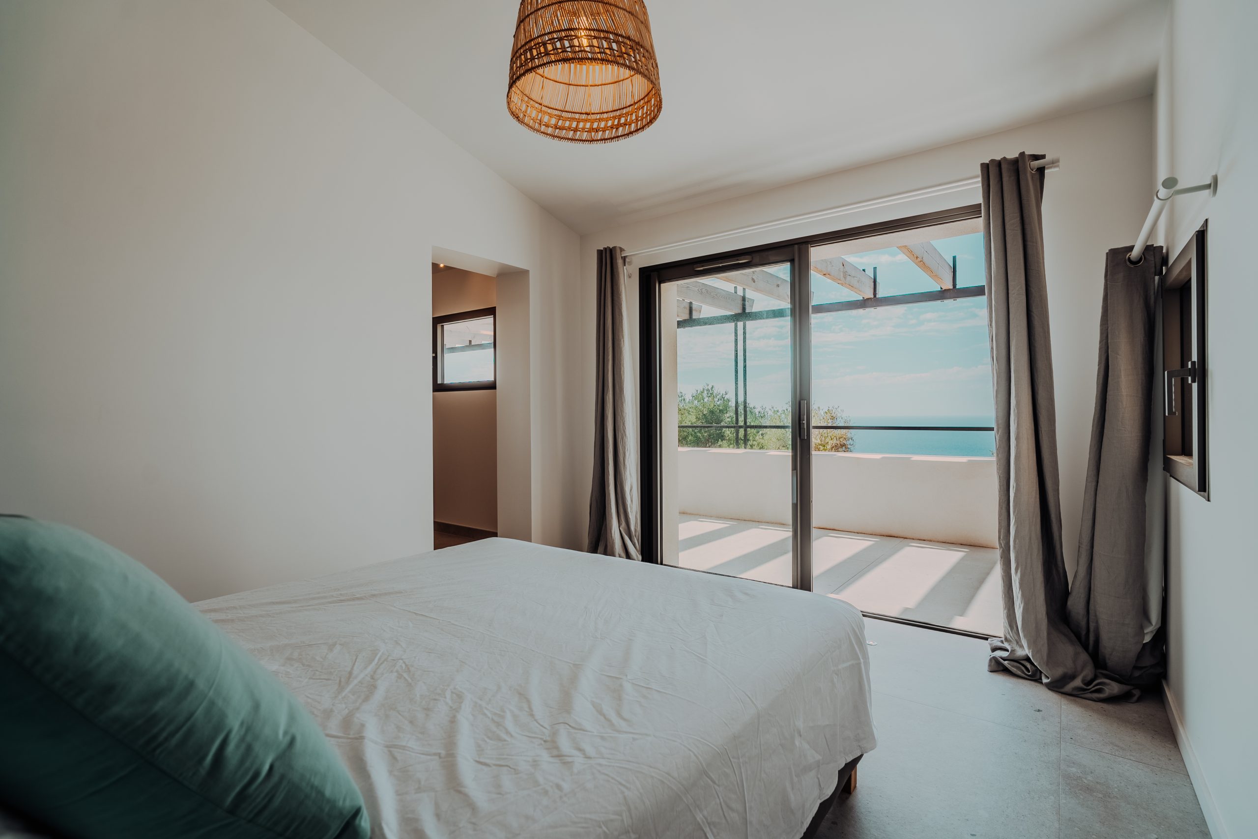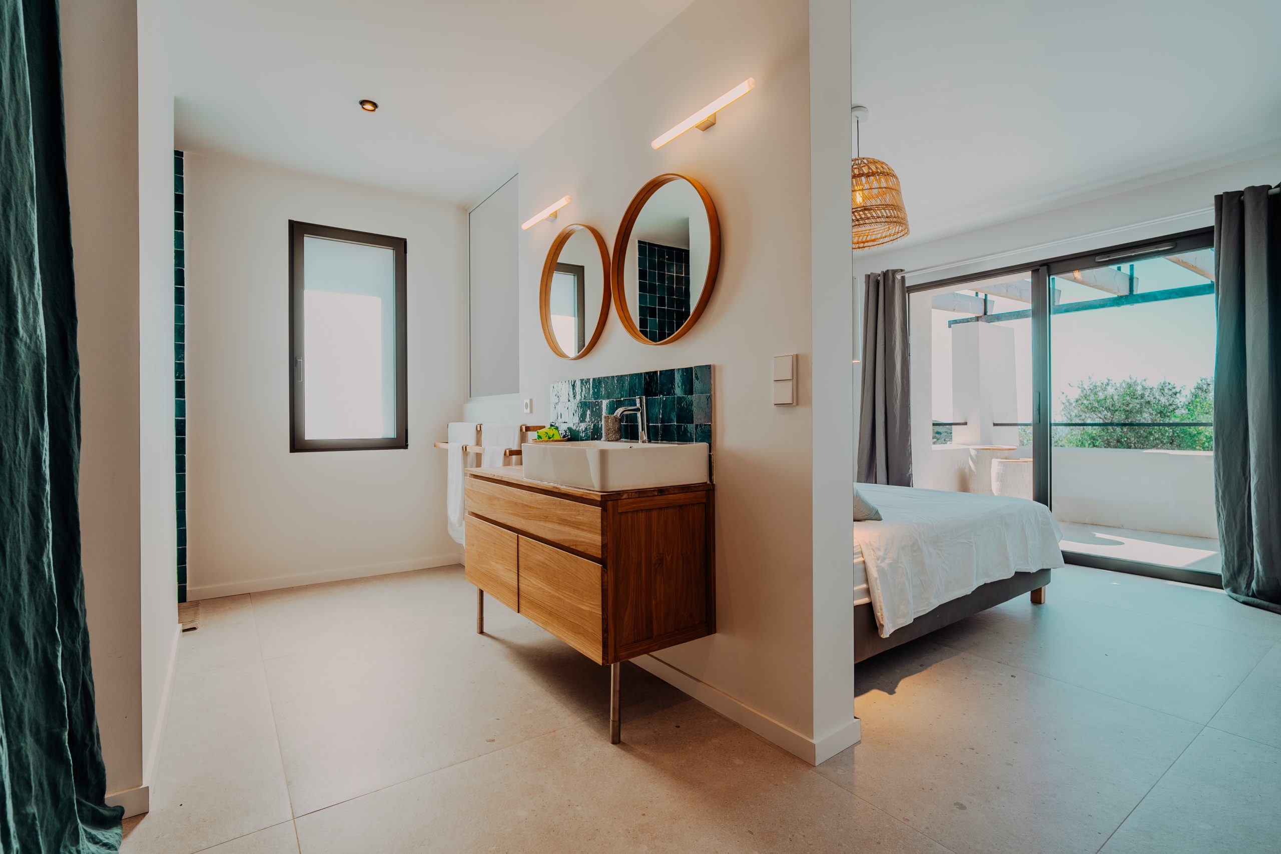À l’étage intermédiaire, cette chambre avec lit double, climatisée et offrant une vue mer, séduit par son élégance et sa sérénité. Elle comprend une salle de bain privative avec douche à l’italienne en zellige marocain et WC séparés. Un accès direct à la terrasse côté cuisine permet de profiter pleinement de l’extérieur et du panorama.