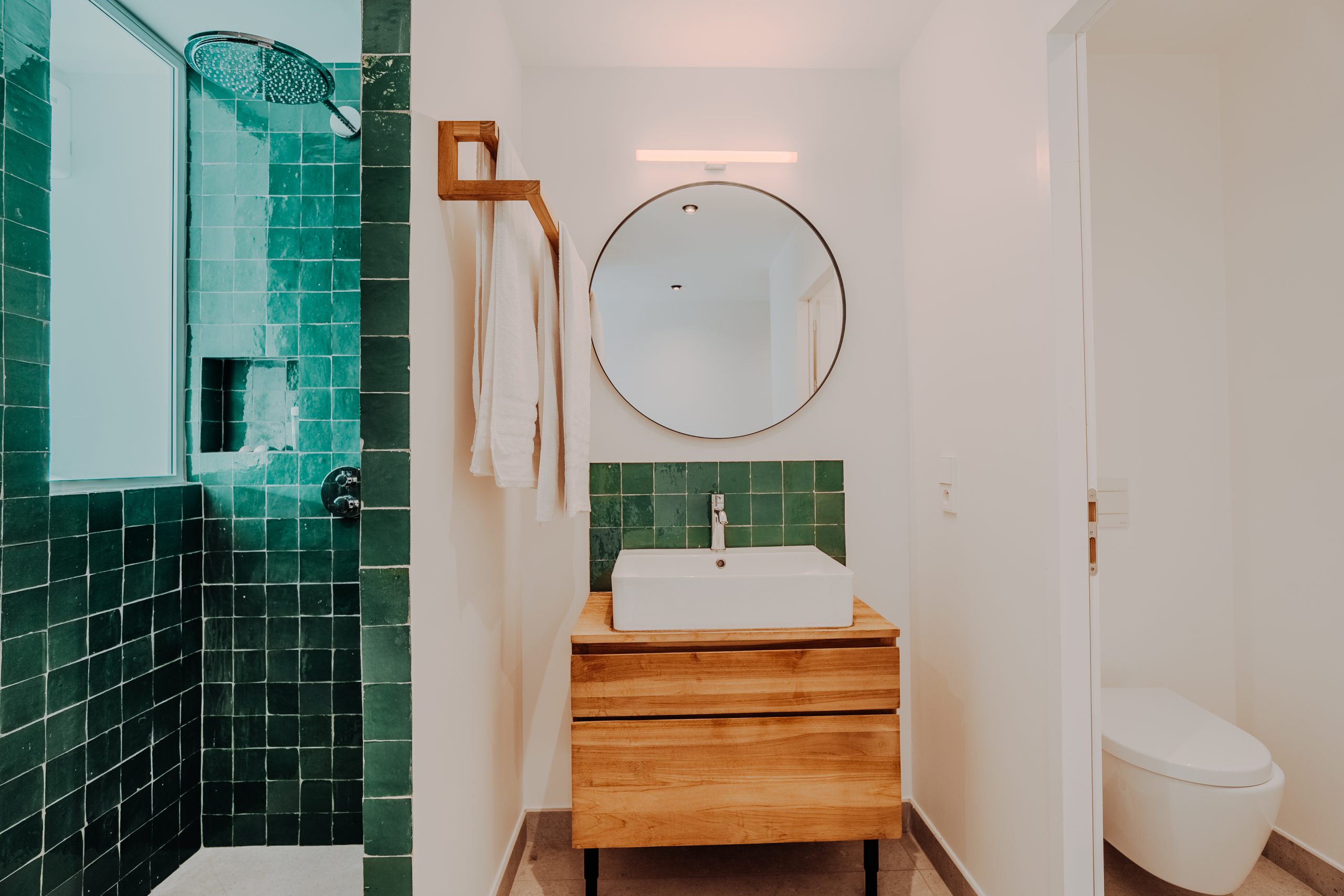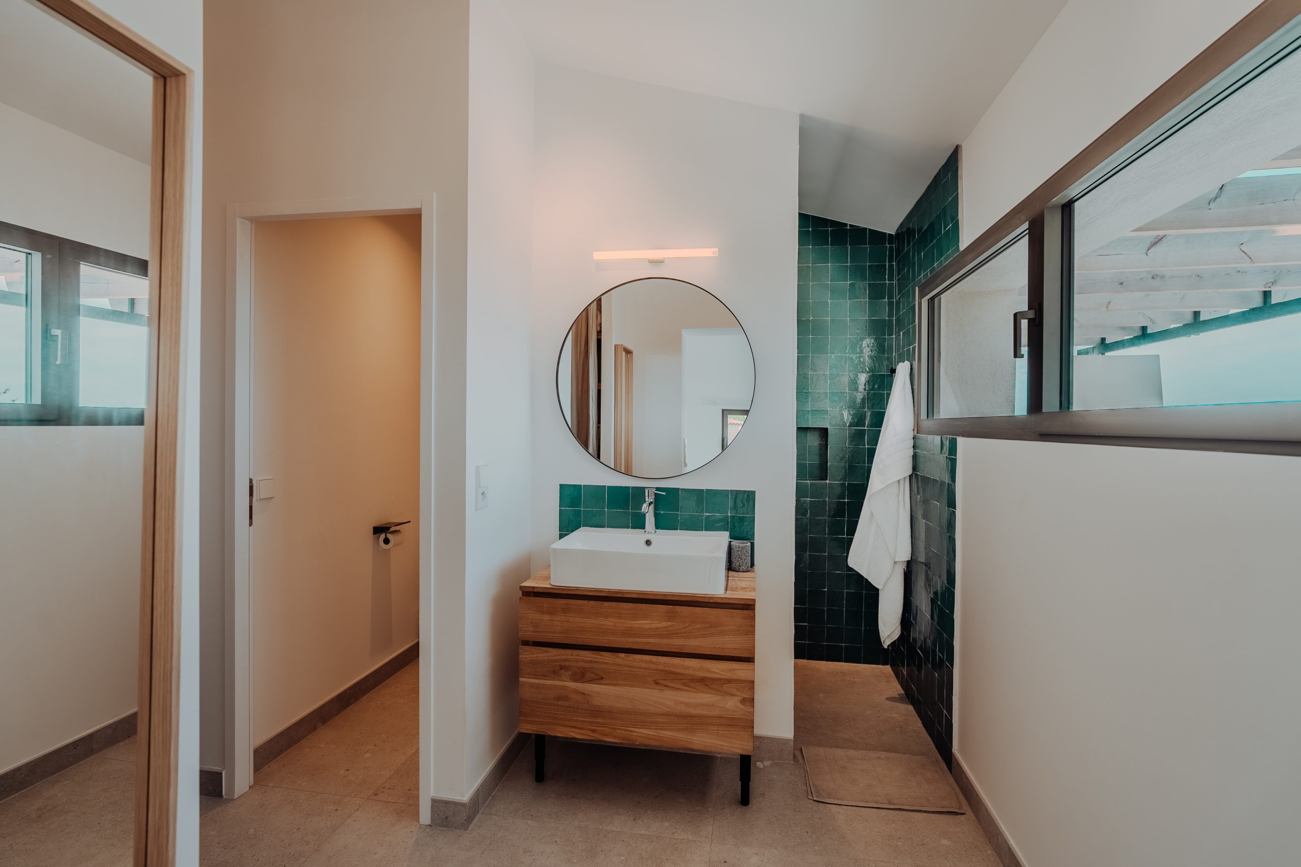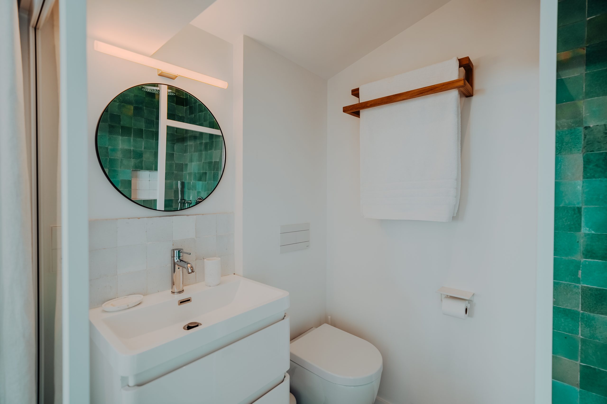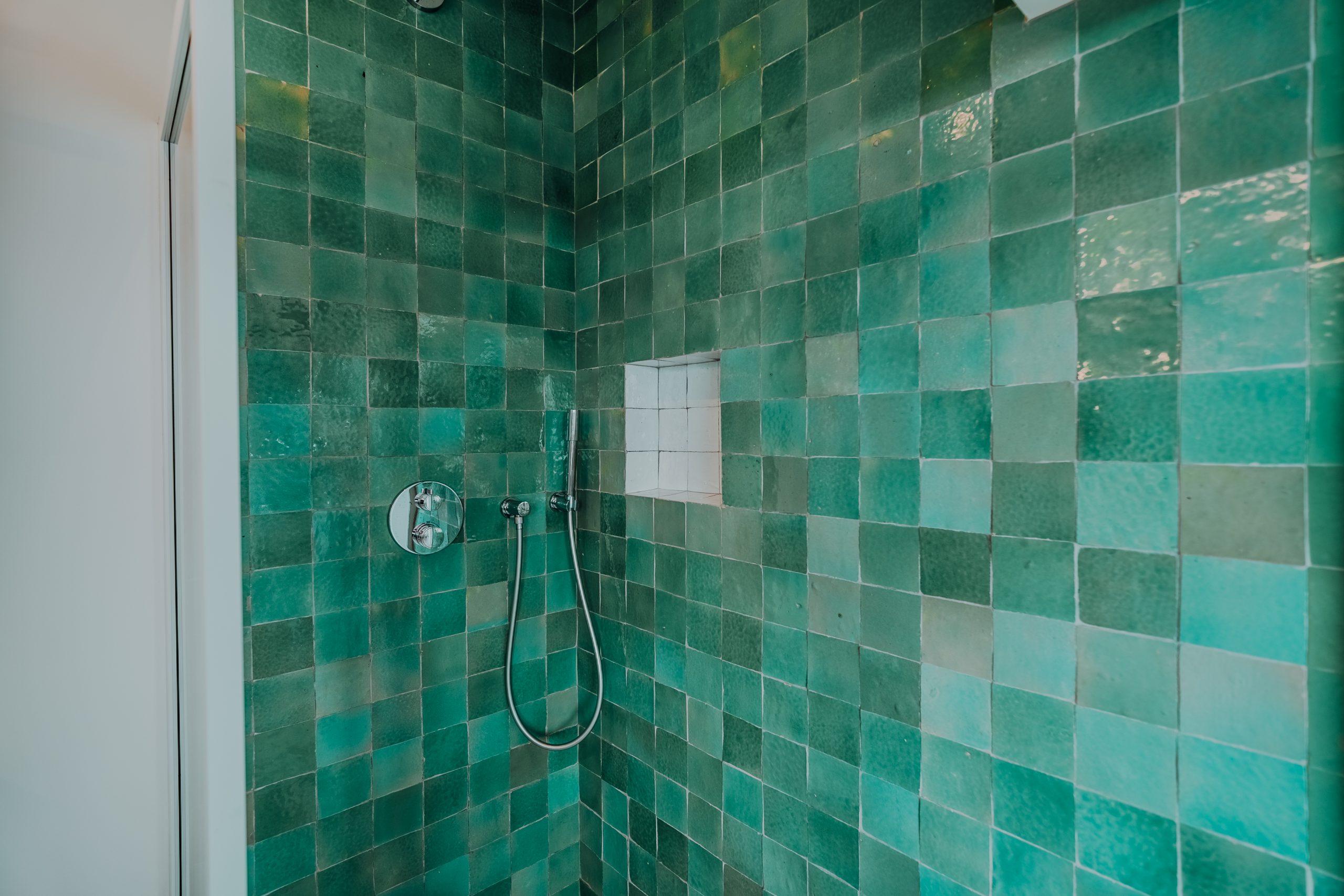 À l’étage intermédiaire, cette chambre avec lit double, climatisée et offrant une vue mer, séduit par son élégance et sa sérénité. Elle comprend une salle de bain privative avec douche à l’italienne en zellige marocain et WC séparés. Un accès direct à la terrasse côté cuisine permet de profiter pleinement de l’extérieur et du panorama.