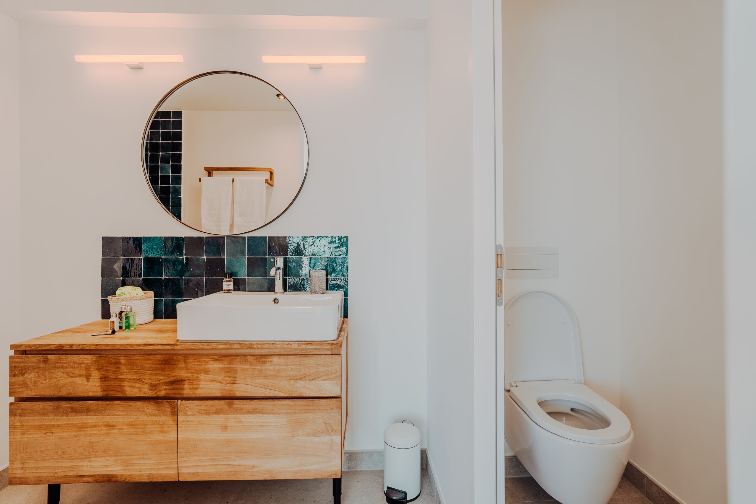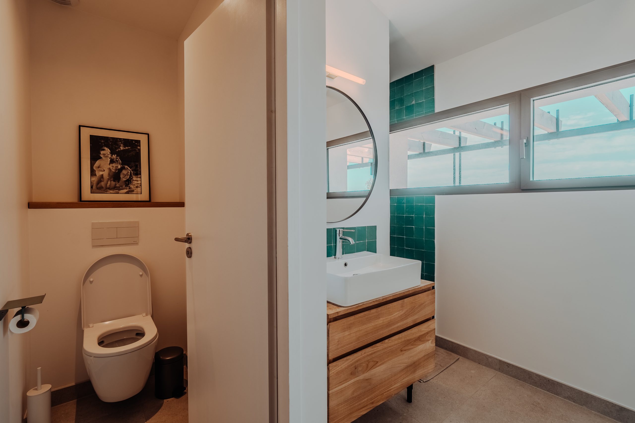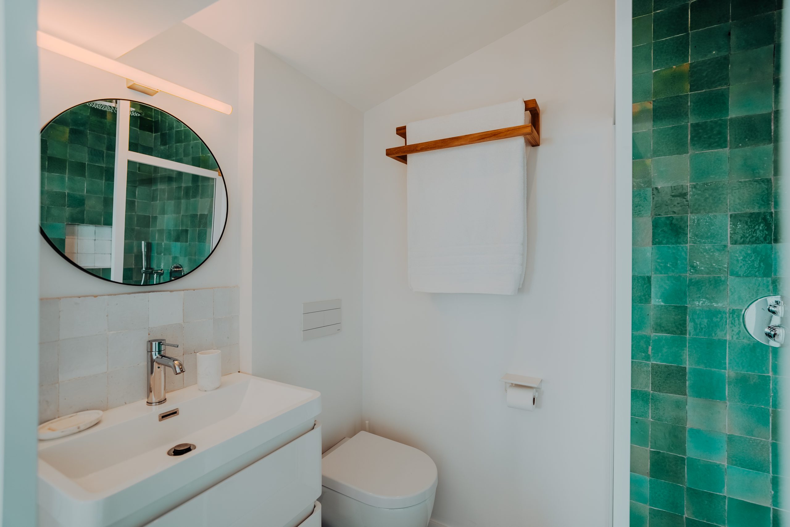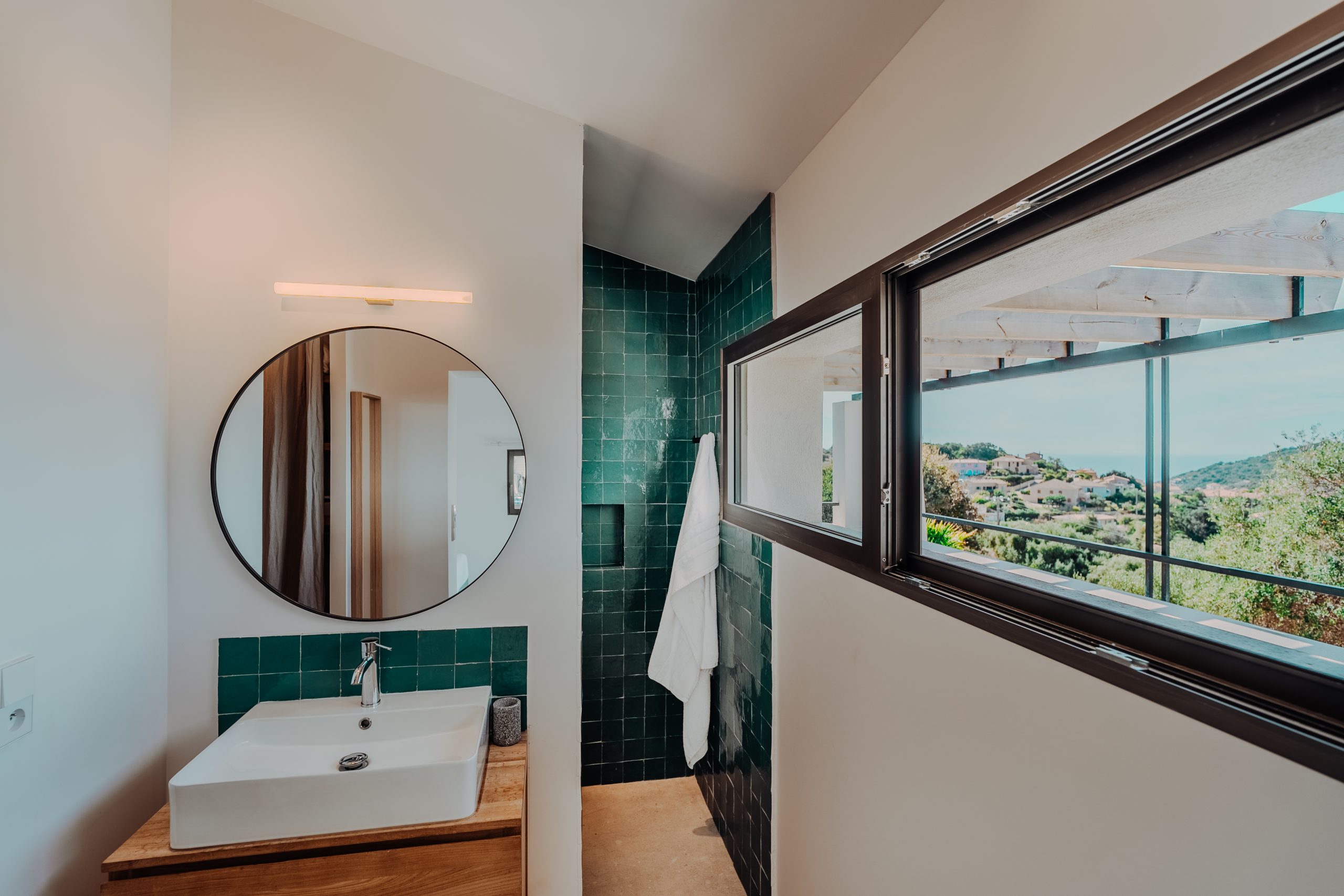 À l’étage intermédiaire, cette chambre avec lit double, climatisée et offrant une vue mer, séduit par son élégance et sa sérénité. Elle comprend une salle de bain privative avec douche à l’italienne en zellige marocain et WC séparés. Un accès direct à la terrasse côté cuisine permet de profiter pleinement de l’extérieur et du panorama.