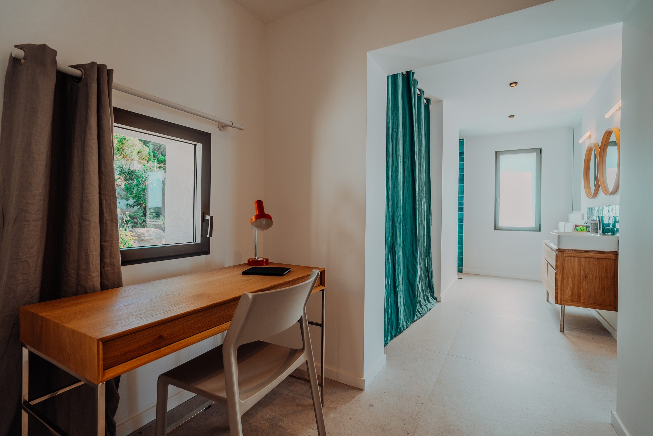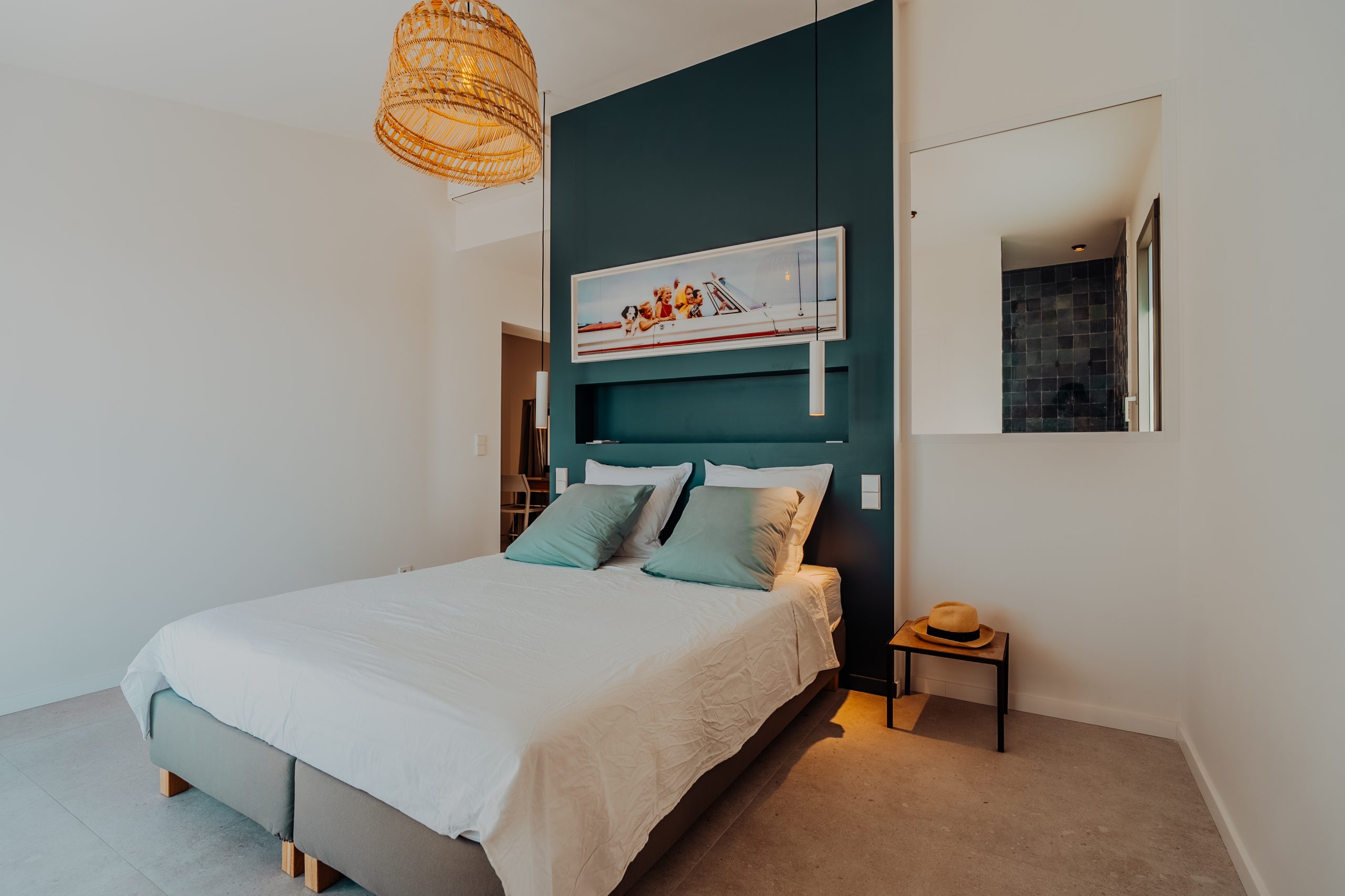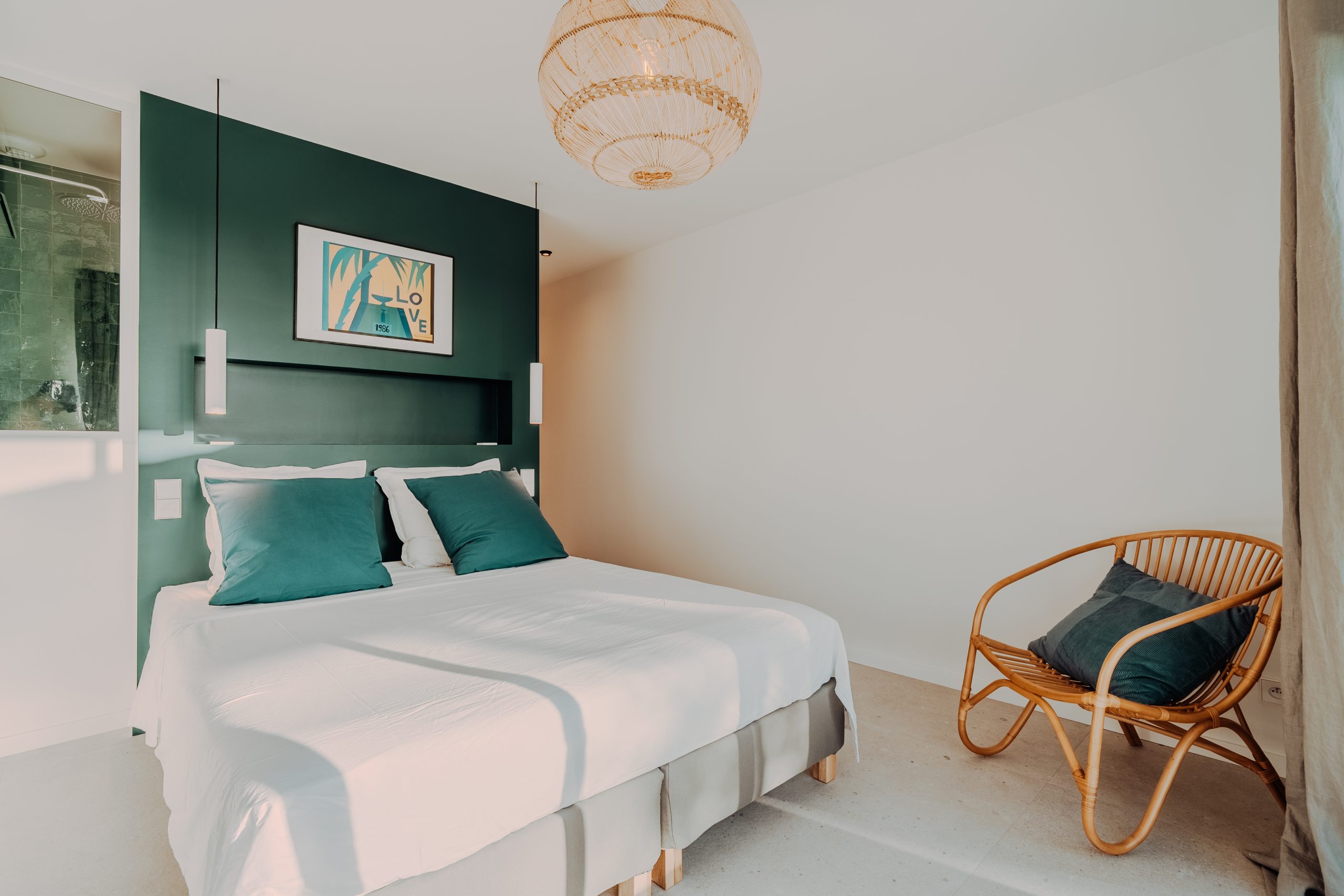À l’étage inférieur, cette chambre avec lit double, climatisée et offrant une vue mer, allie simplicité et élégance. Elle est équipée d’une salle de bain privative avec douche à l’italienne en zellige marocain et WC séparés, et bénéficie d’un accès direct à la terrasse de la piscine.