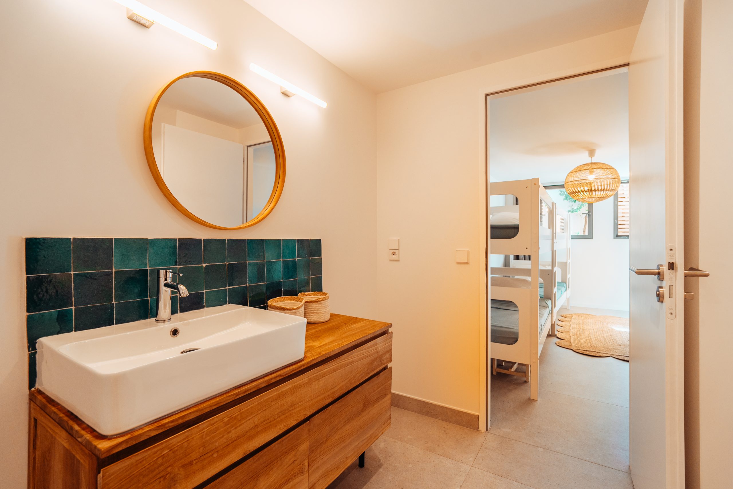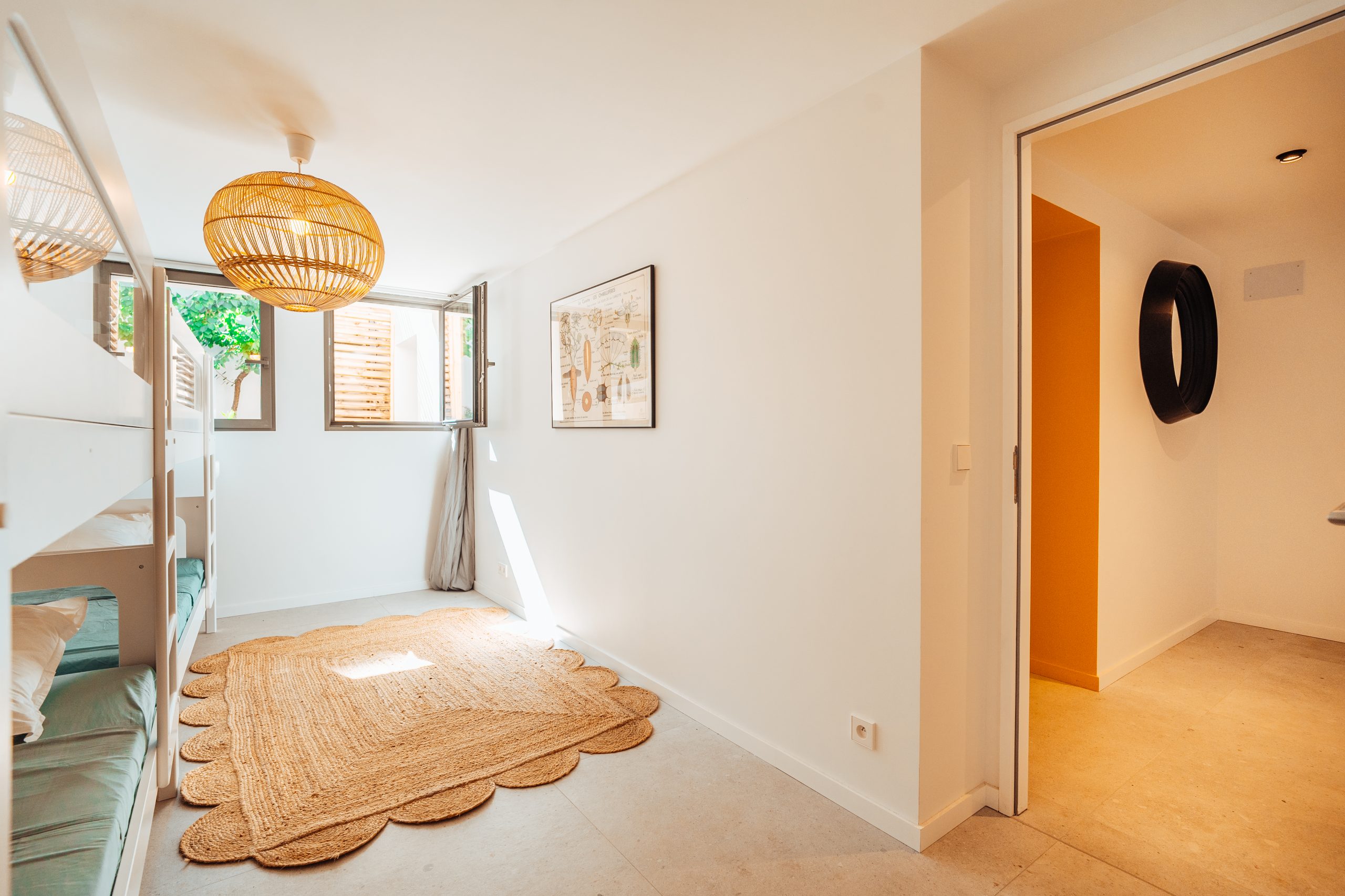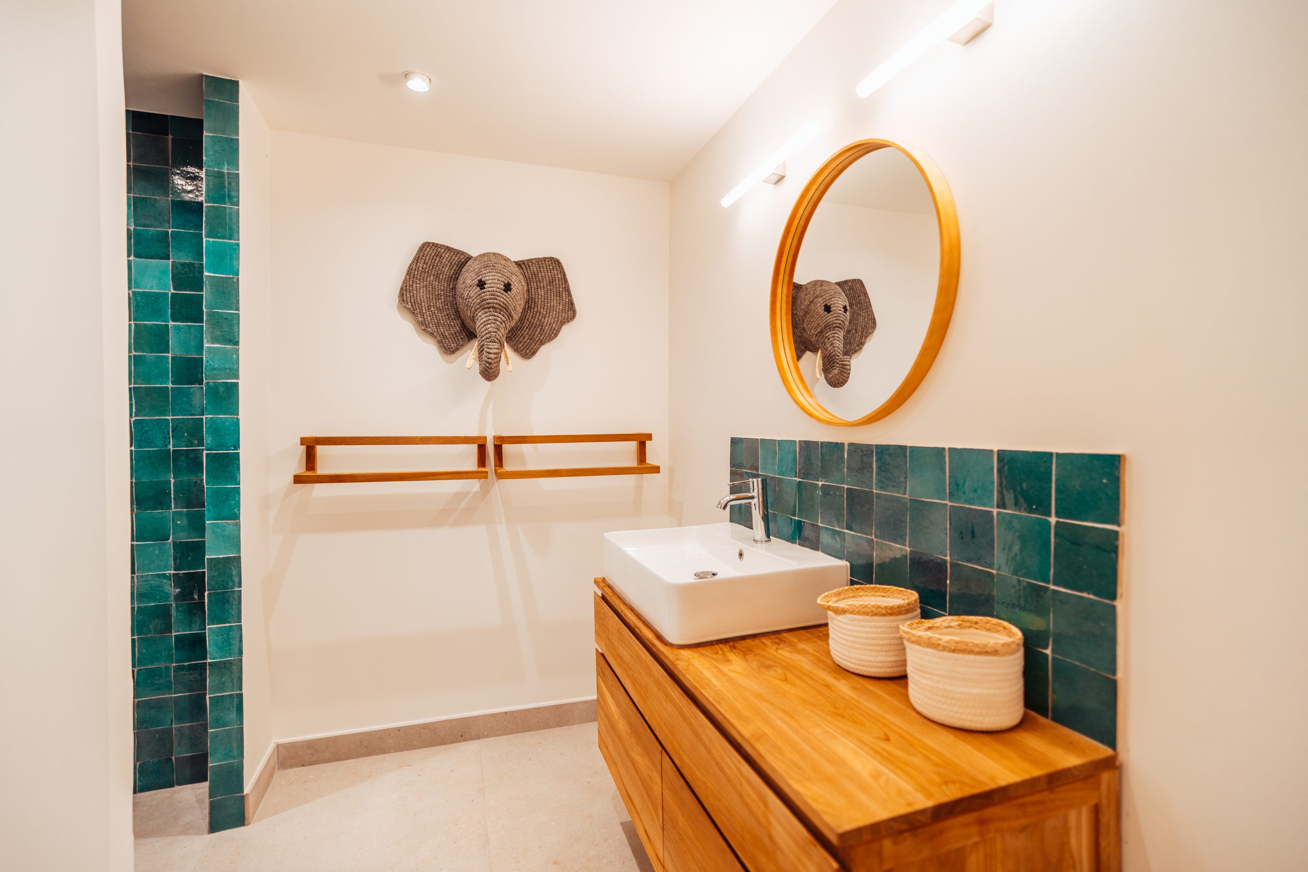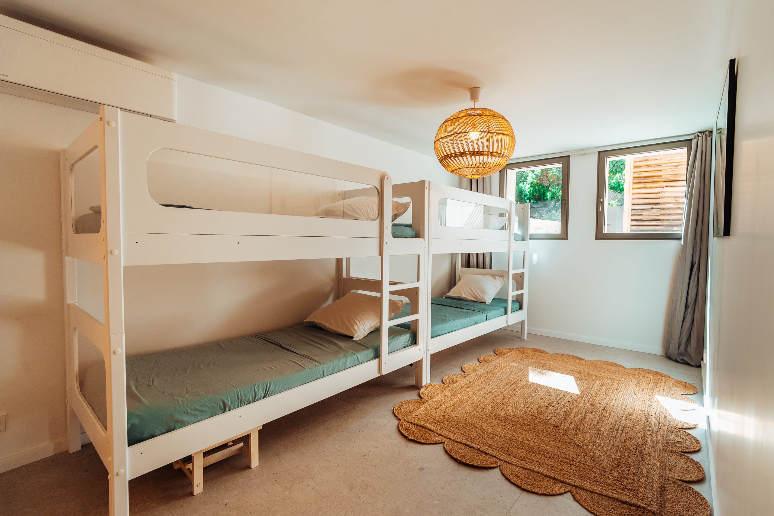 La maison comprend également une chambre enfants avec deux lits superposés, parfaite pour les plus jeunes. Elle dispose d’une salle de bain privative avec douche à l’italienne en zellige marocain et WC séparés, offrant confort et autonomie dans un esprit familial.