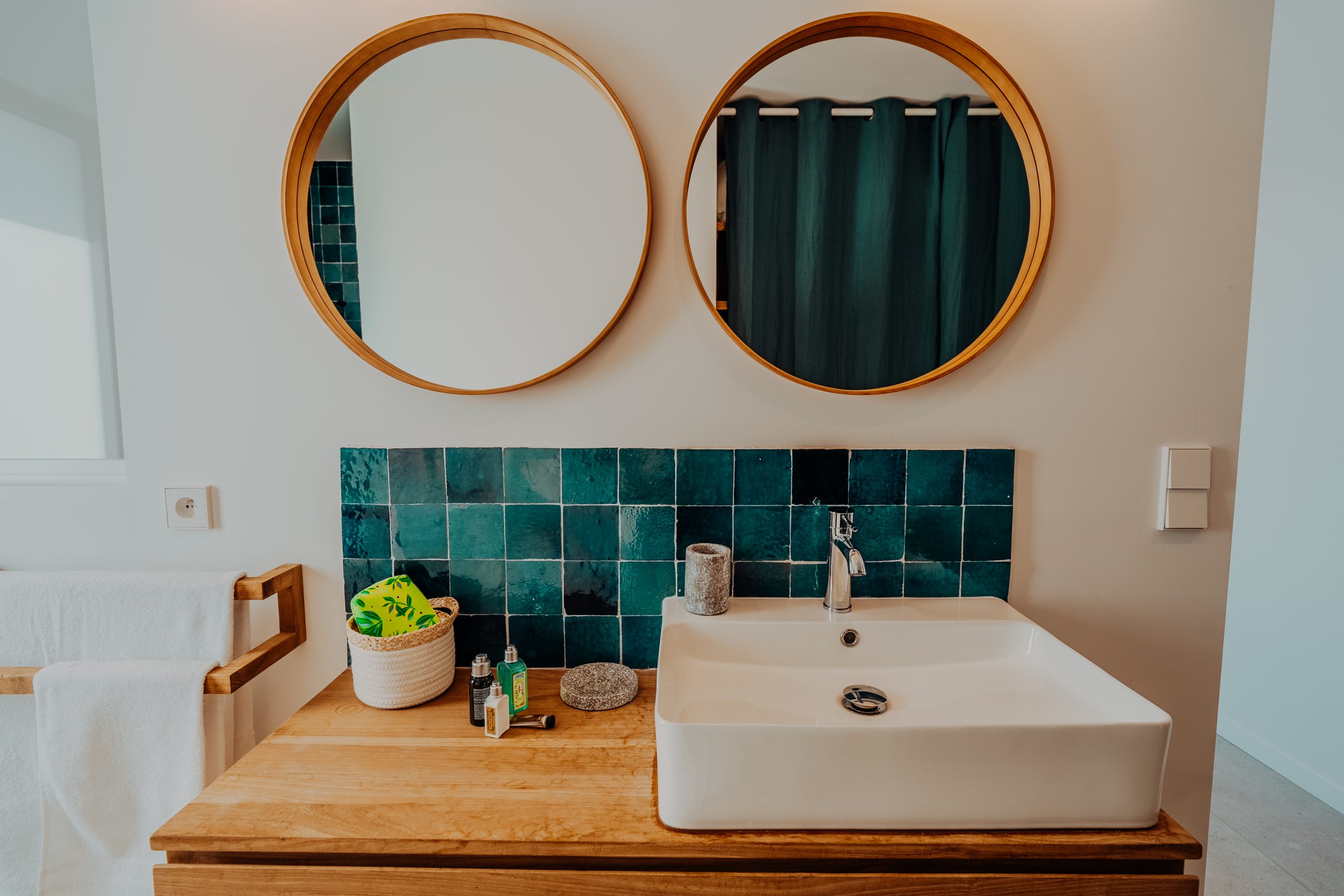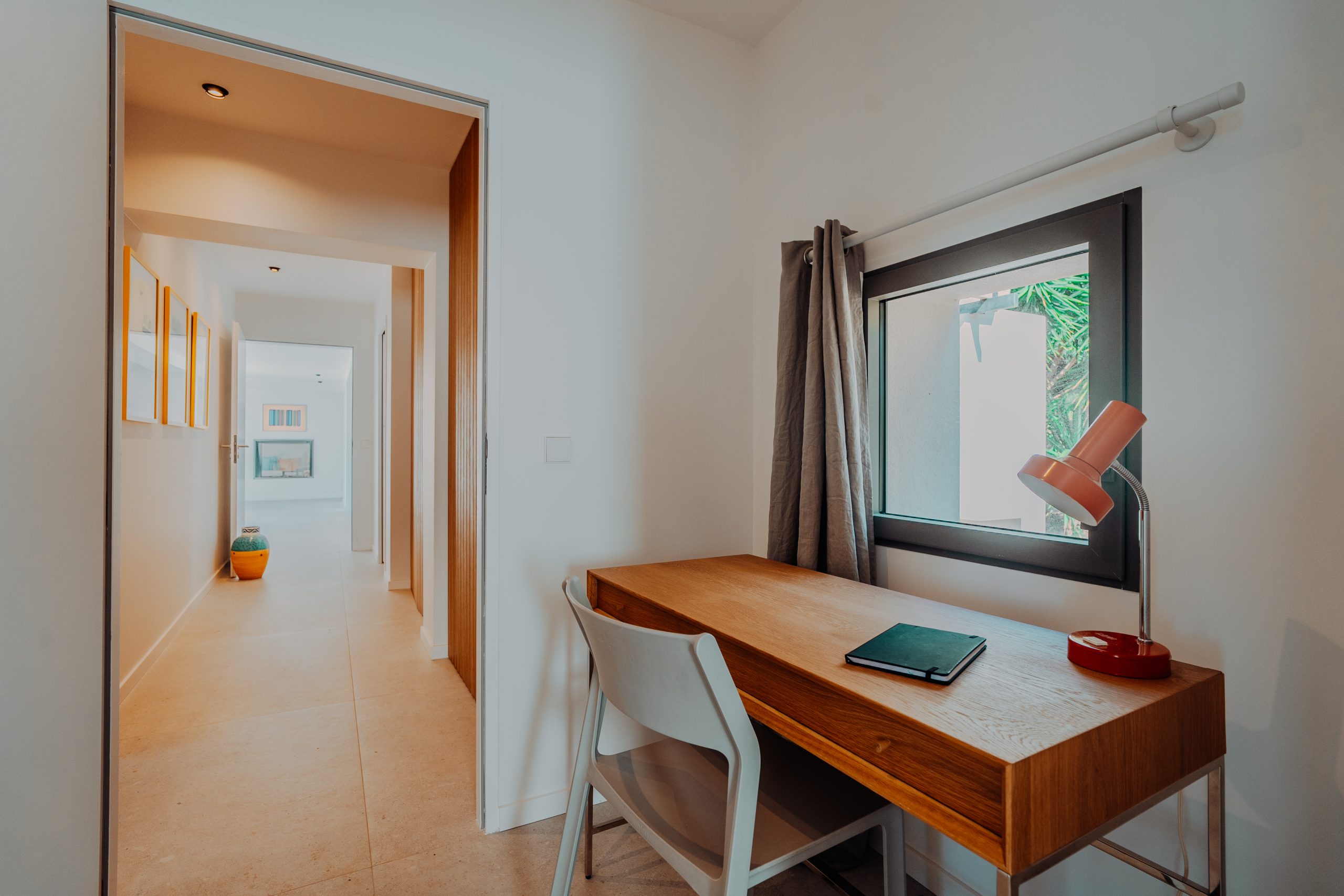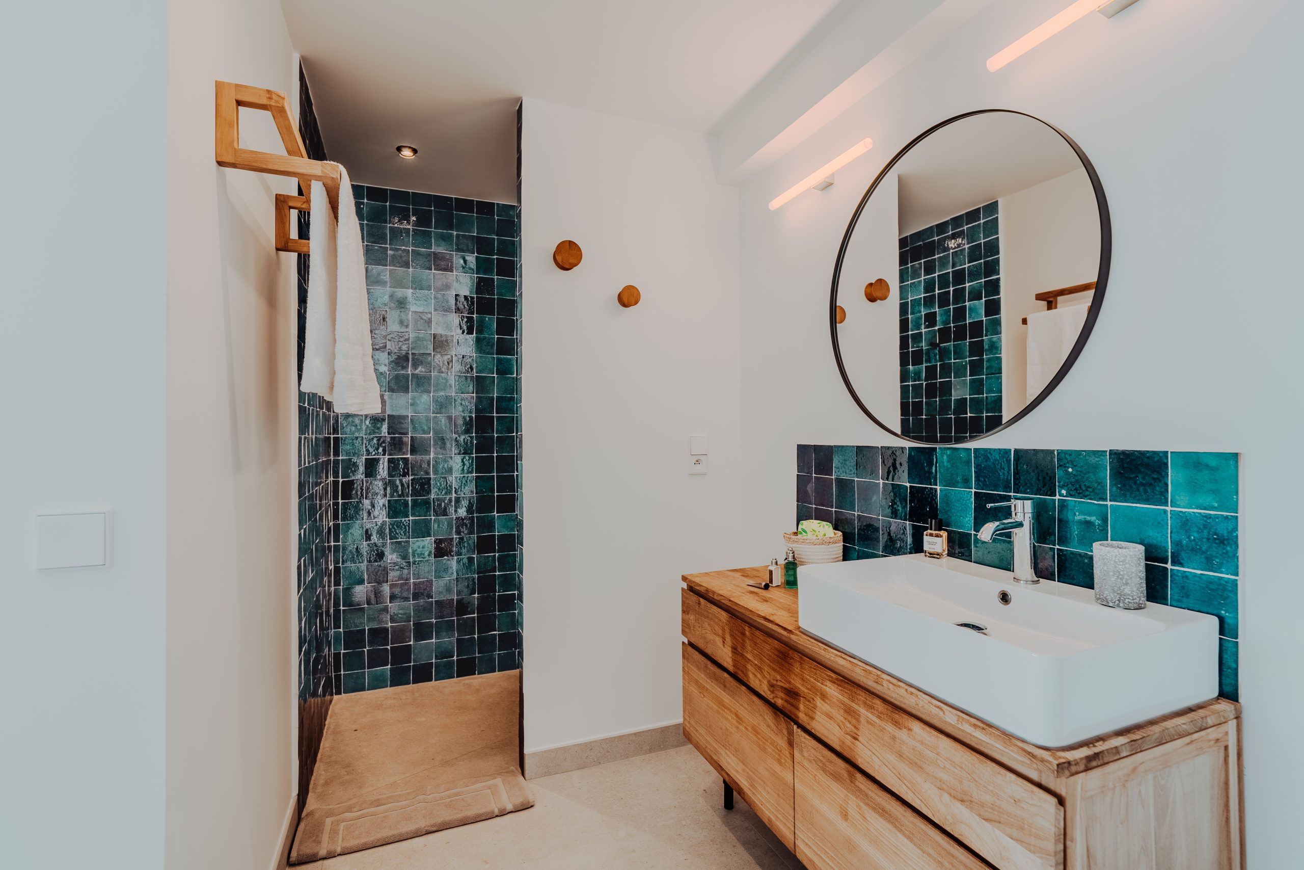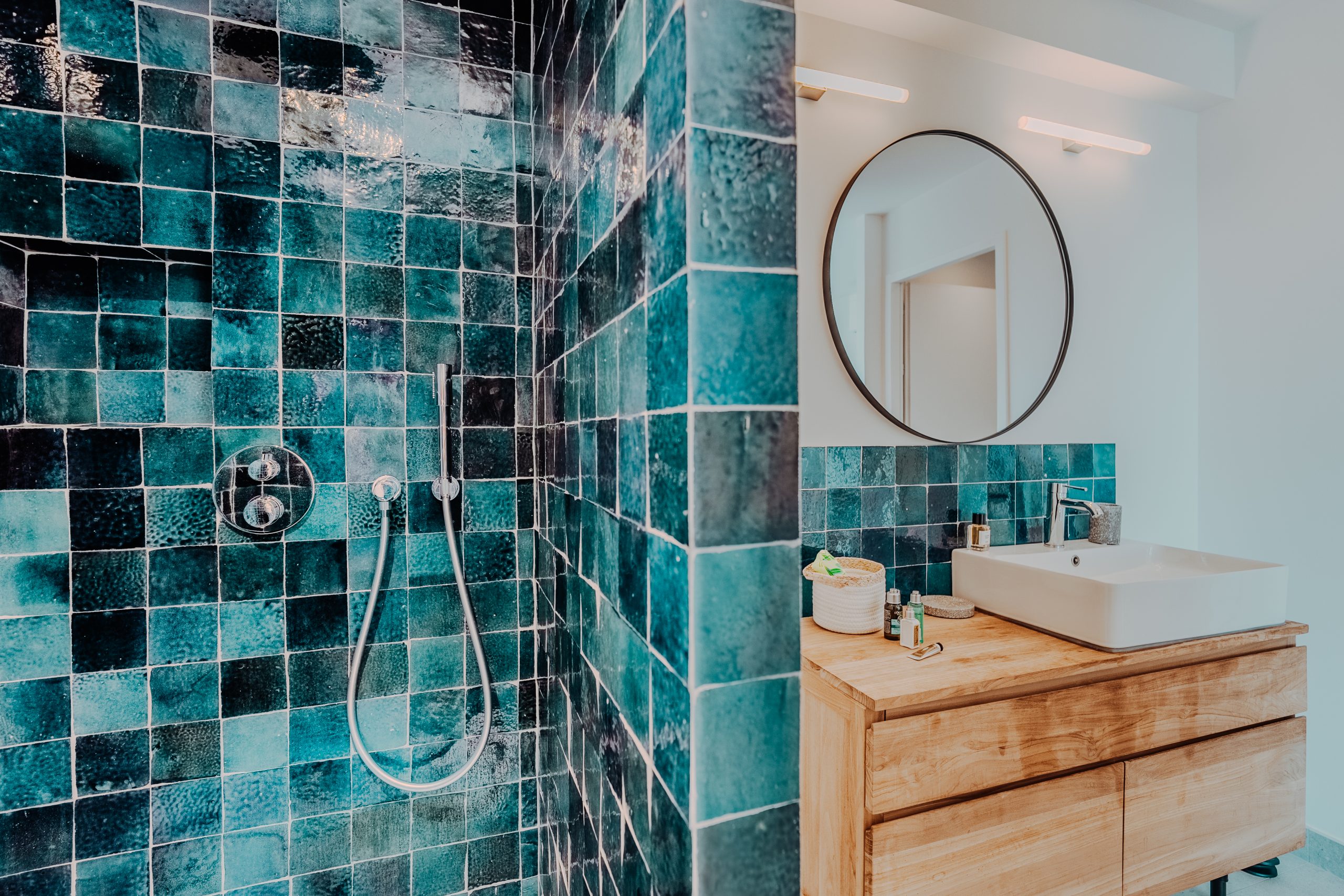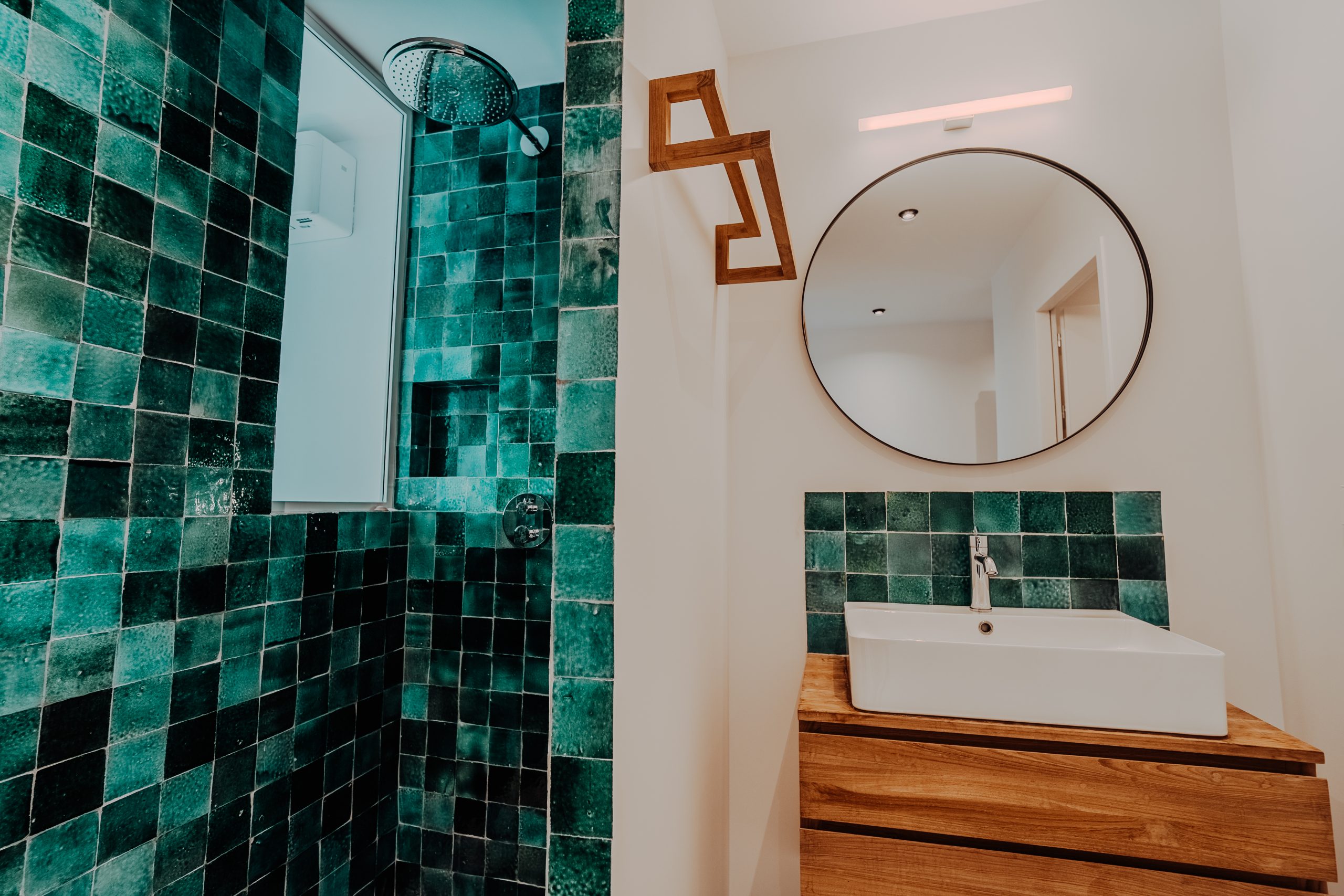 La maison comprend également une chambre enfants avec deux lits superposés, parfaite pour les plus jeunes. Elle dispose d’une salle de bain privative avec douche à l’italienne en zellige marocain et WC séparés, offrant confort et autonomie dans un esprit familial.