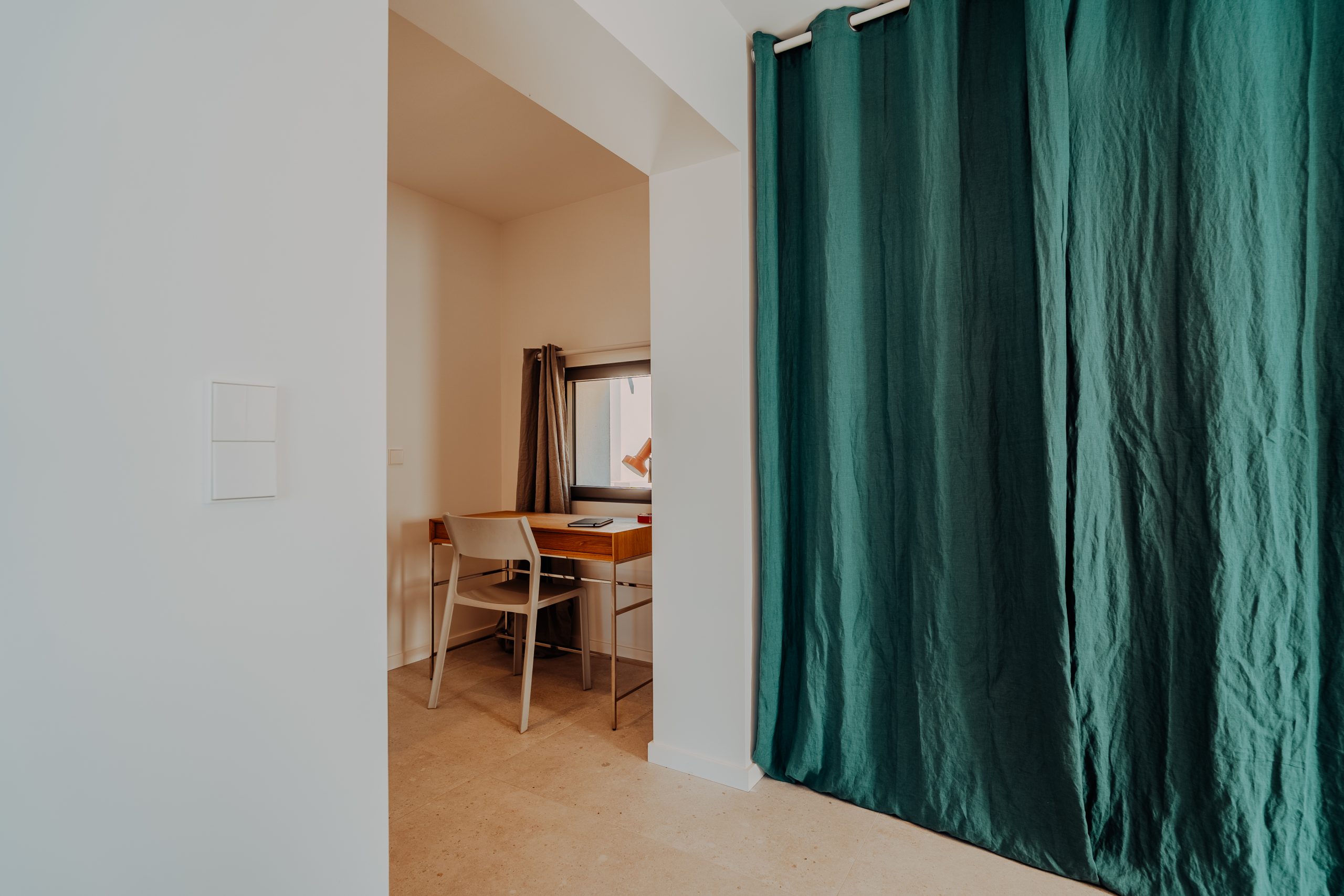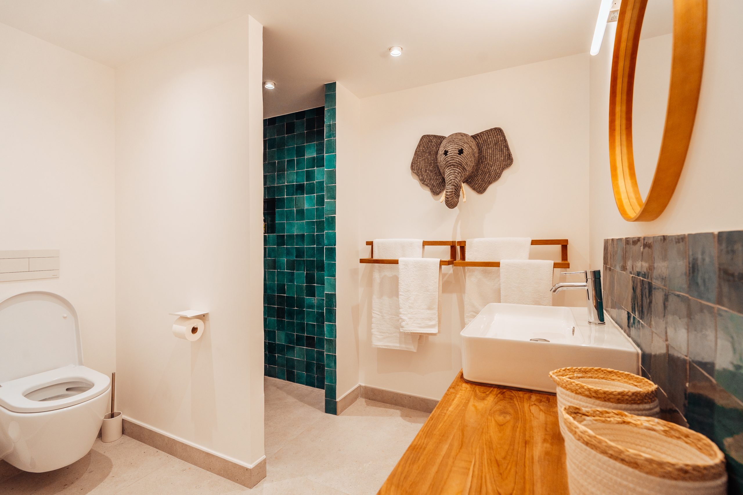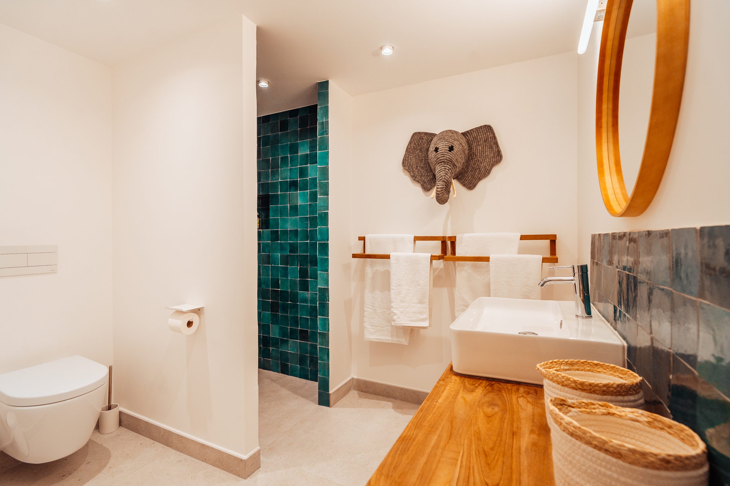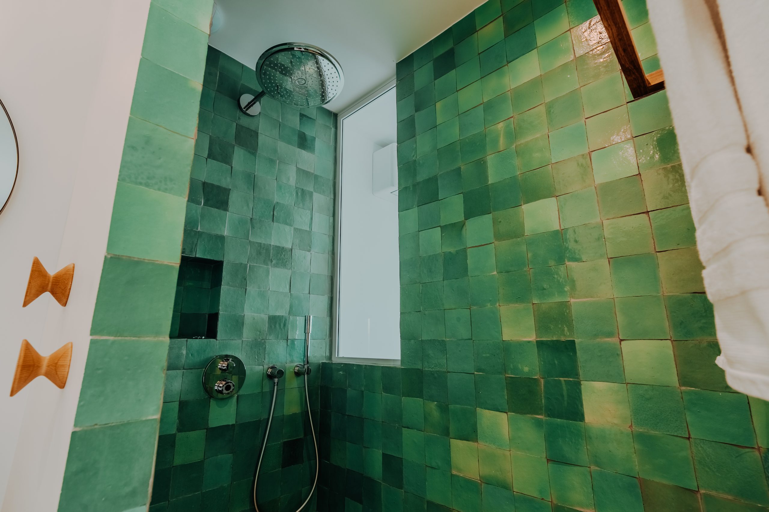 À l’étage inférieur, cette chambre avec lit double propose une atmosphère apaisante, idéale pour un séjour reposant. Climatisée, elle comprend une salle de bain privative avec douche à l’italienne en zellige marocain et WC séparés, avec un accès direct à la terrasse de la piscine.