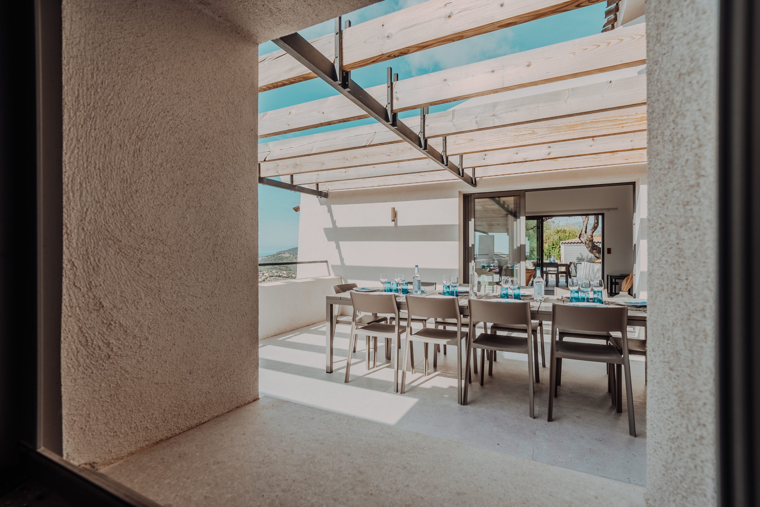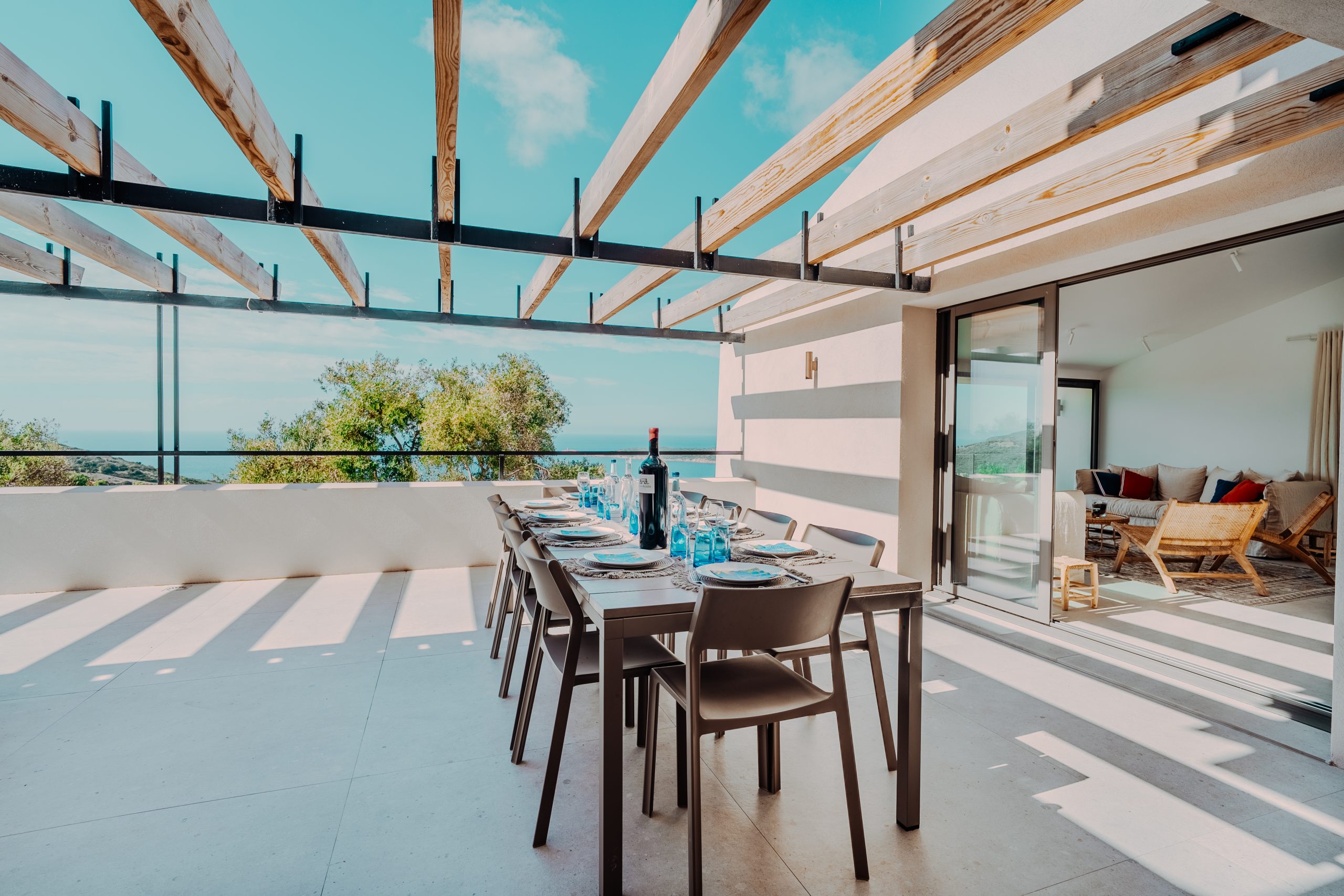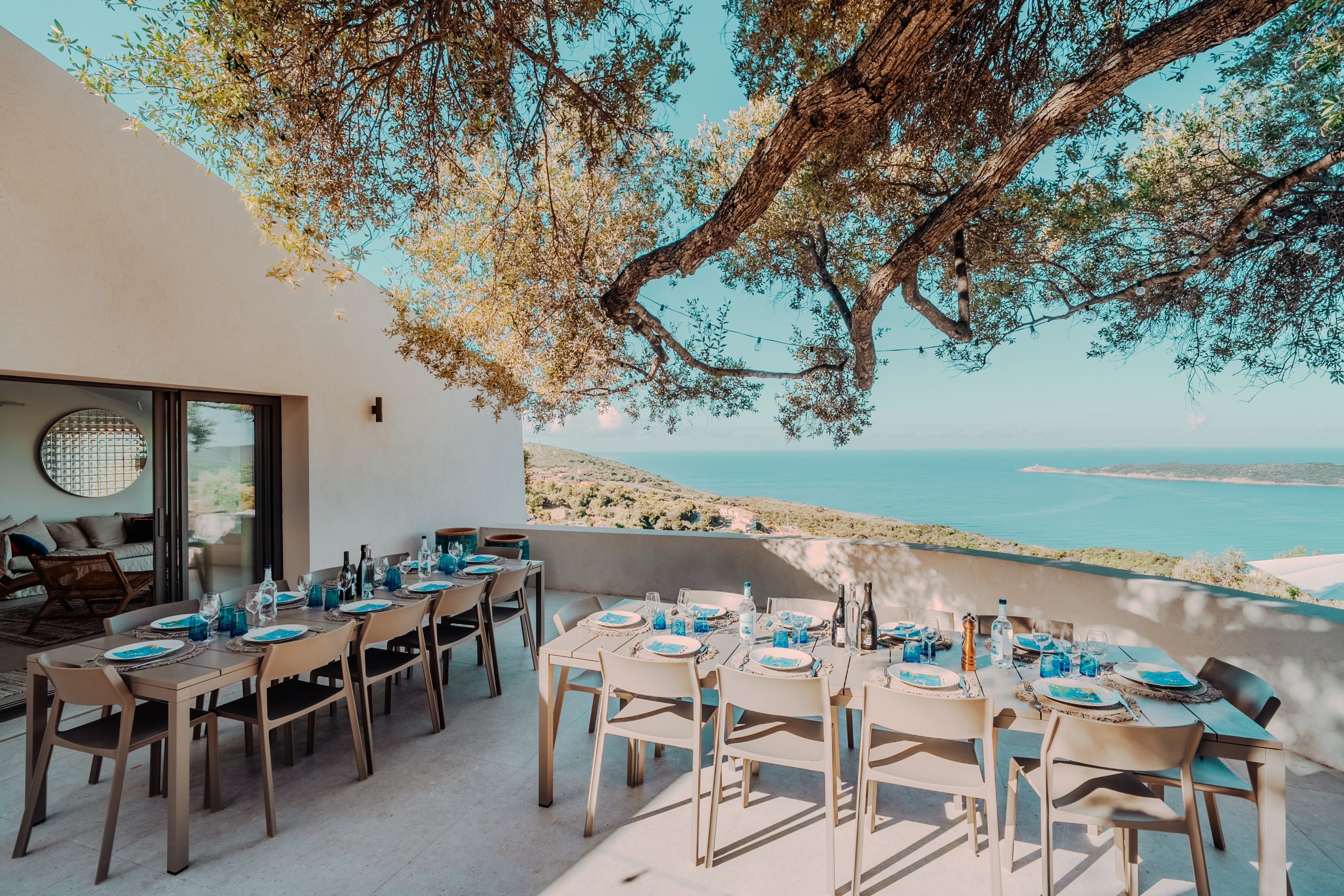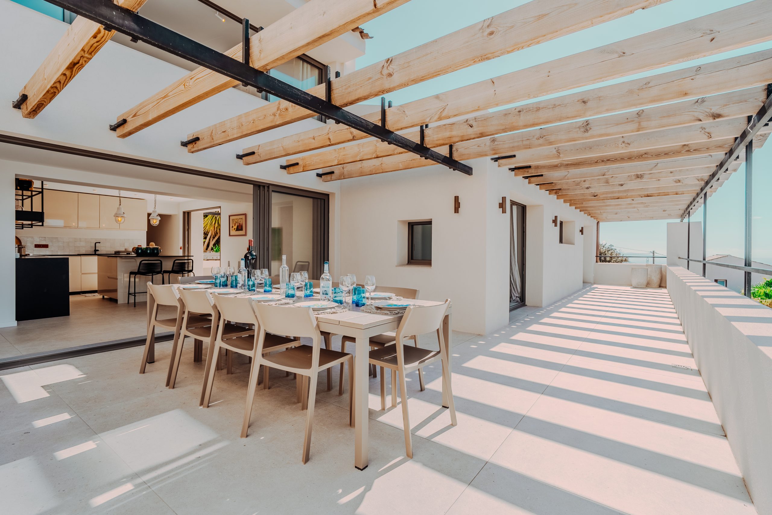 La terrasse côté cuisine fait le lien entre le salon et la cuisine, et offre une vue mer à 180 degrés.