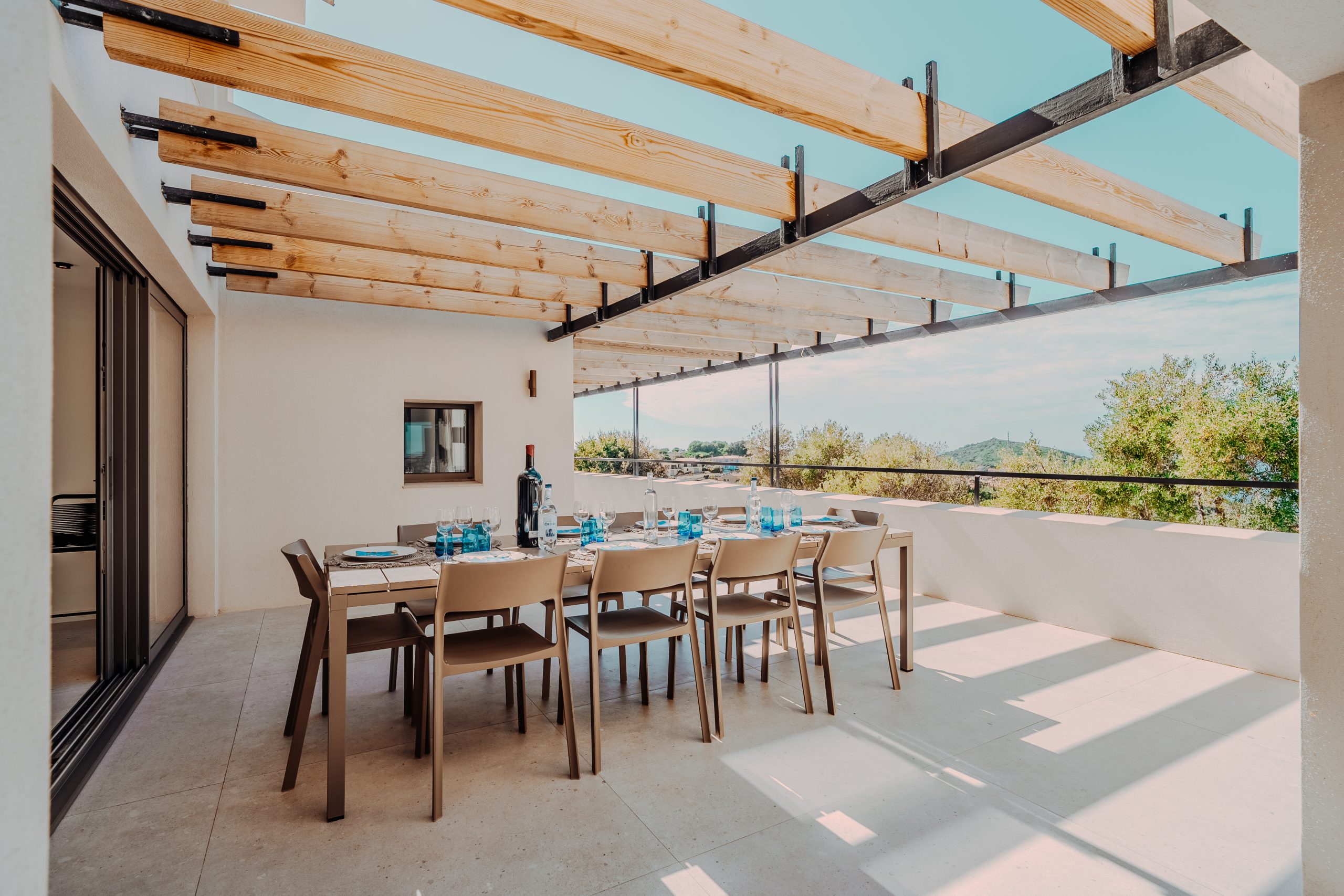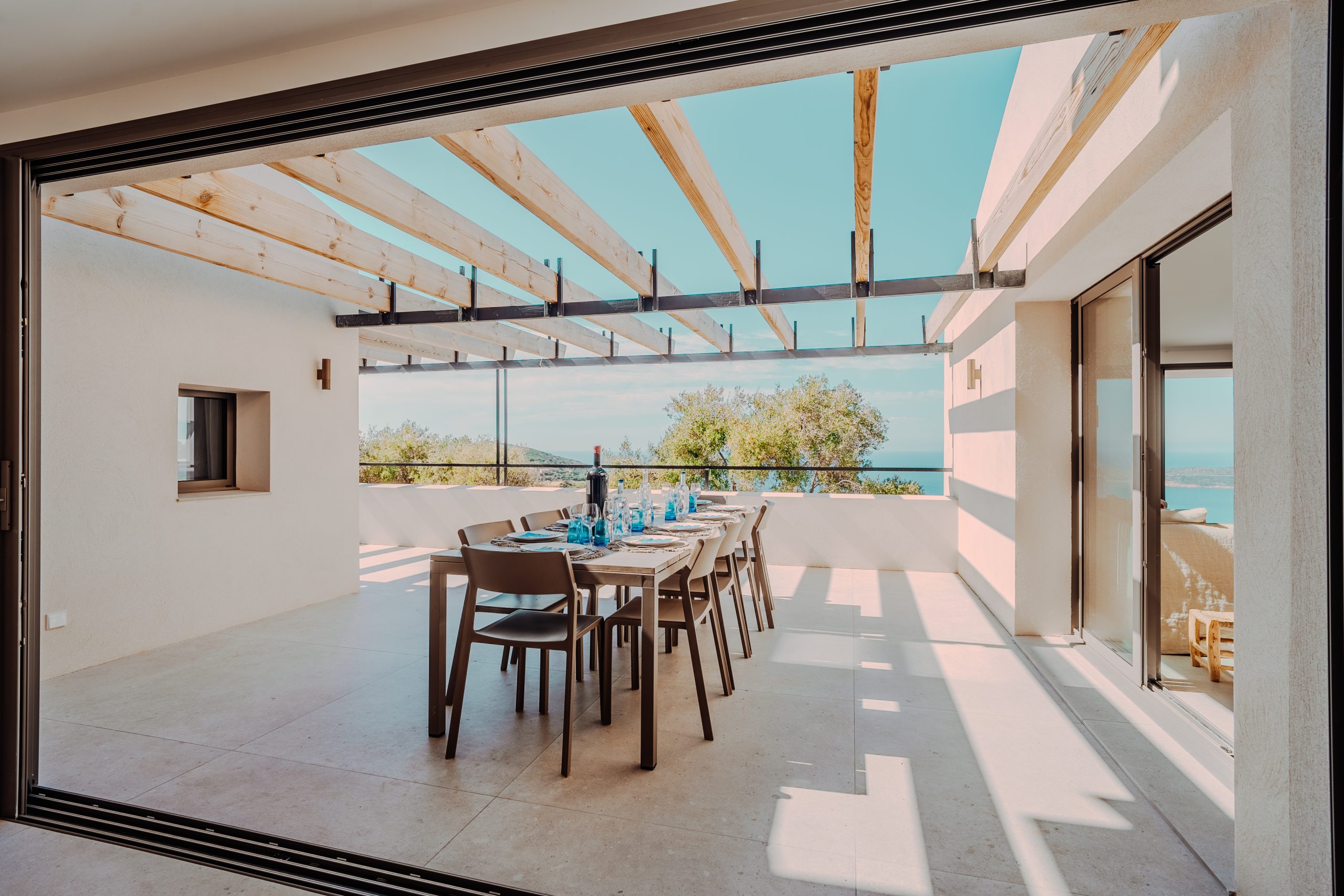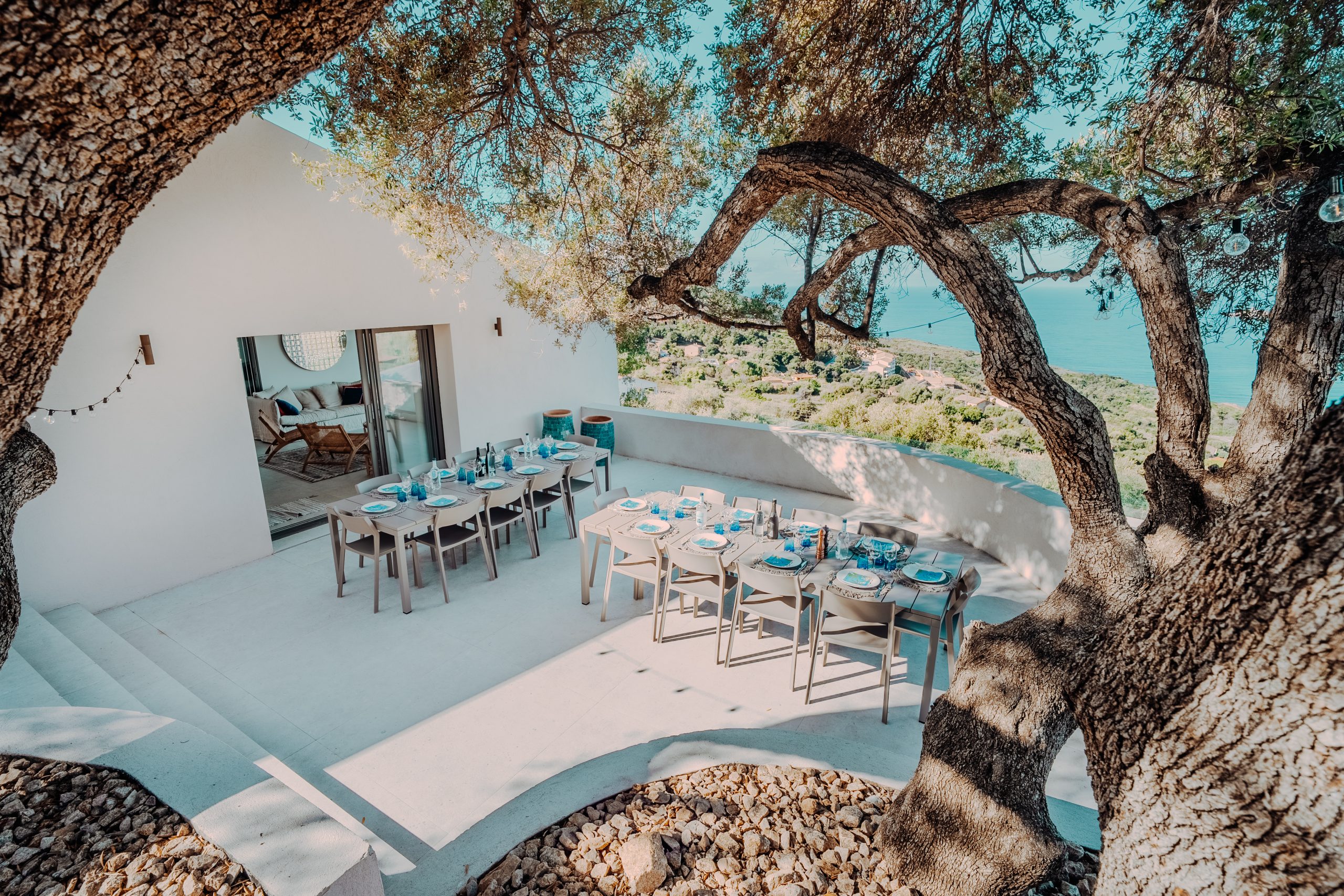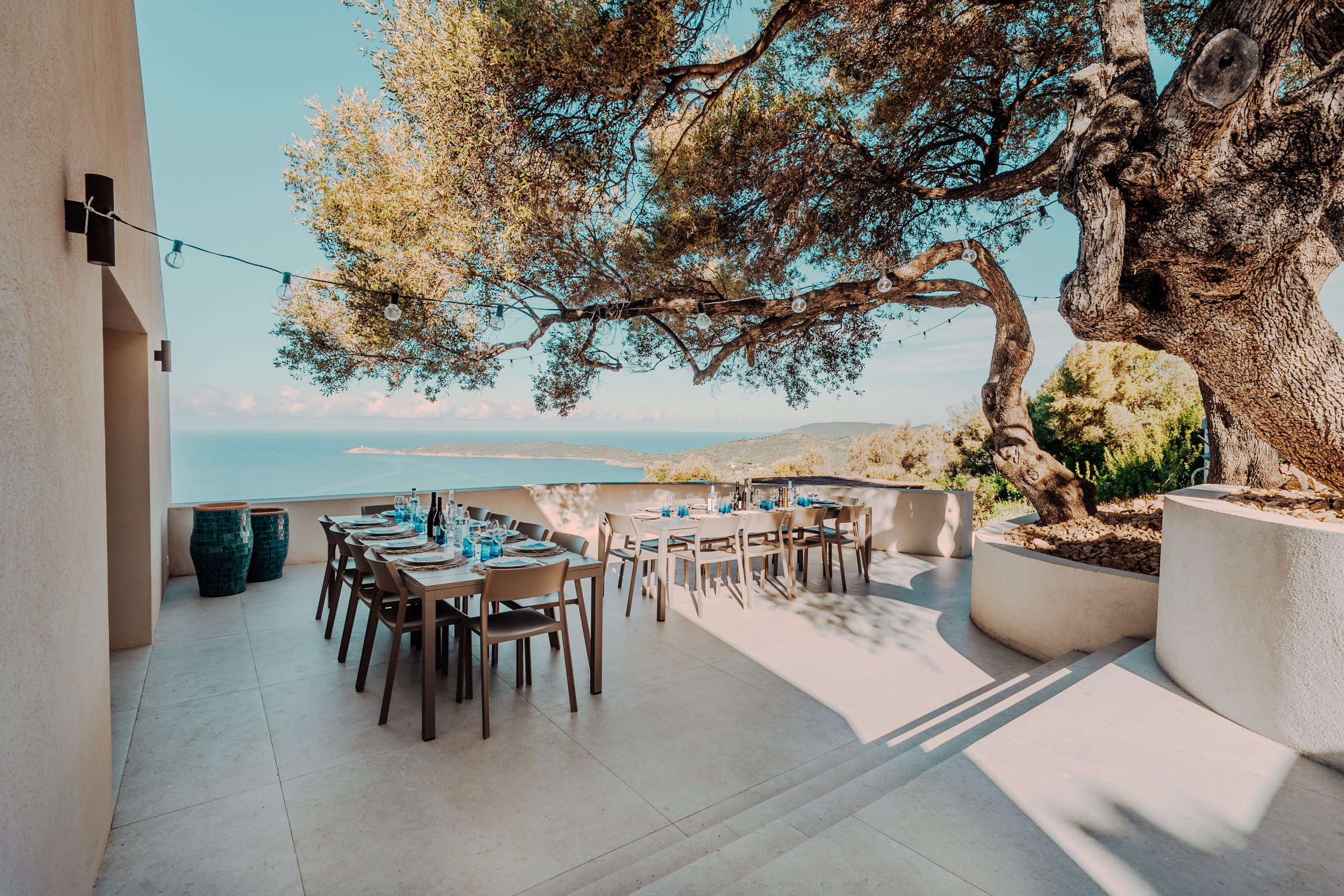 La terrasse côté cuisine fait le lien entre le salon et la cuisine, et offre une vue mer à 180 degrés.